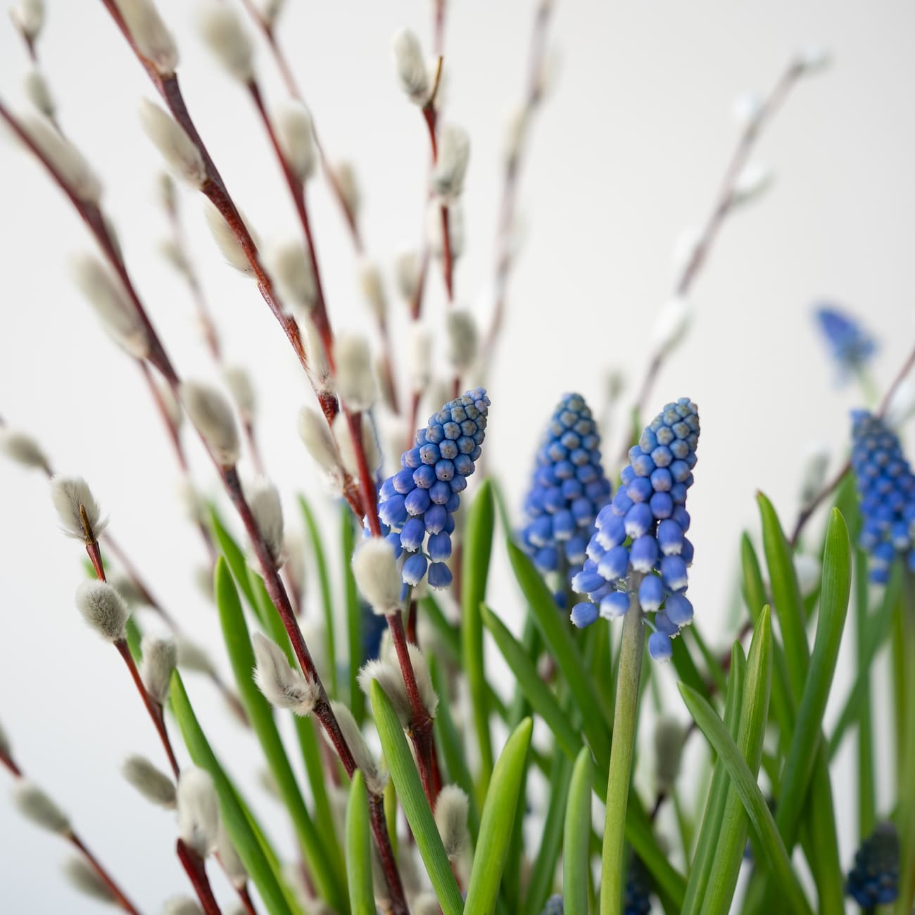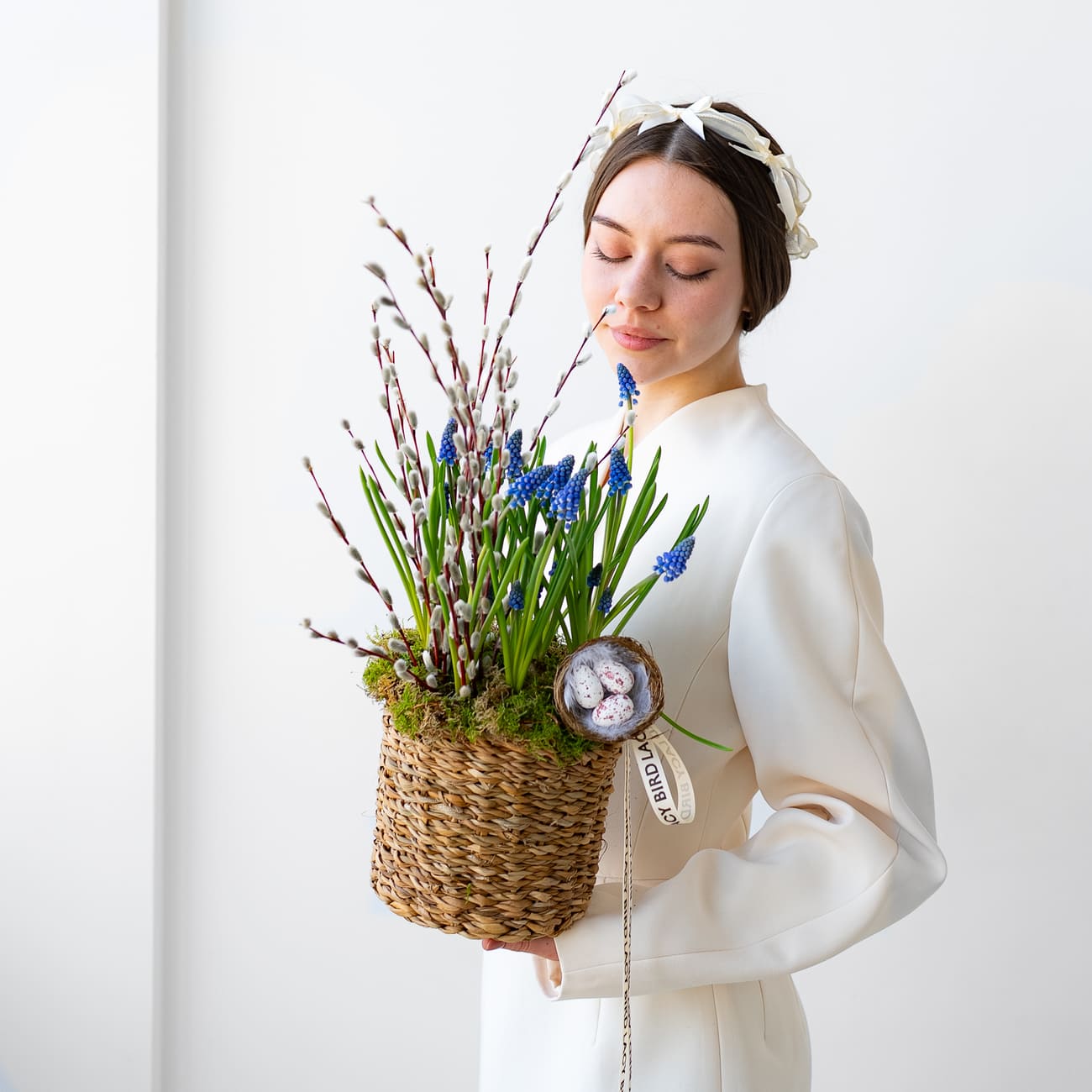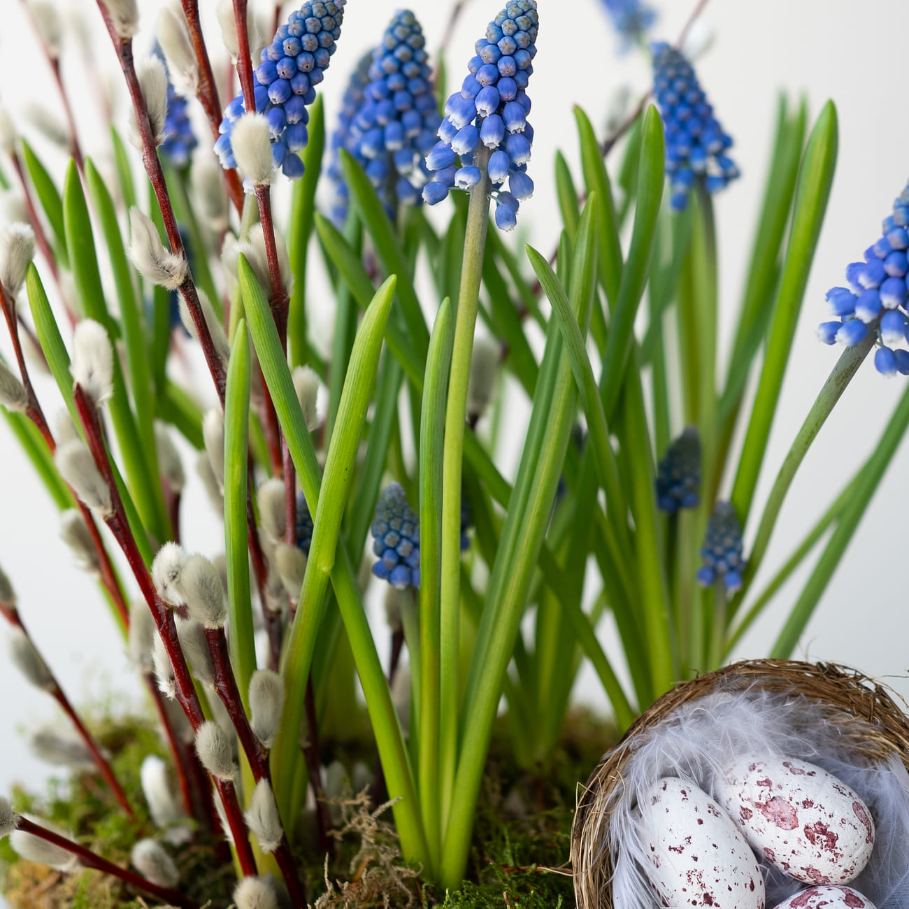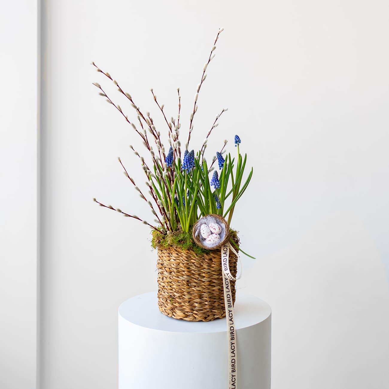 Мы собрали для вас пасхальную композицию в корзине из натурального рогоза с первоцветами и веточками вербы. В корзине посажены луковицы мускари, которые будут долго радовать вас своей красотой.