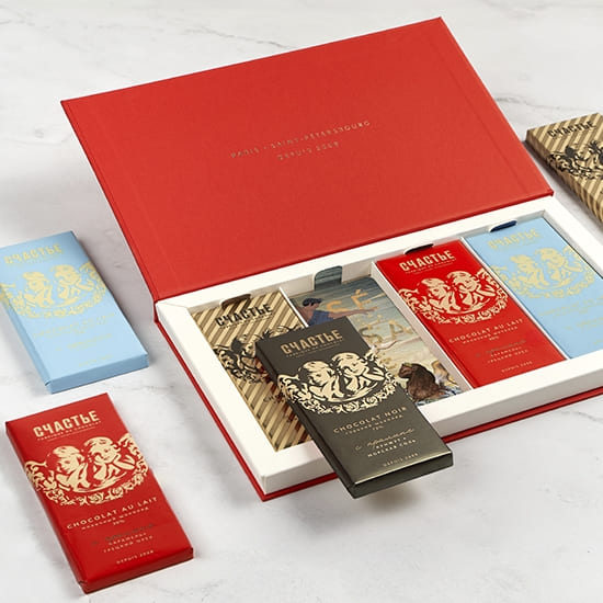 Шоколад — это любовь и эмоции, которые умножаются, когда несколько плиток встречаются в одном наборе… В нашей коробочке собрались любимые виды шоколада с сердцем из пралине, а под ними спрятались сказочные сюжеты по мотивам вкусов.