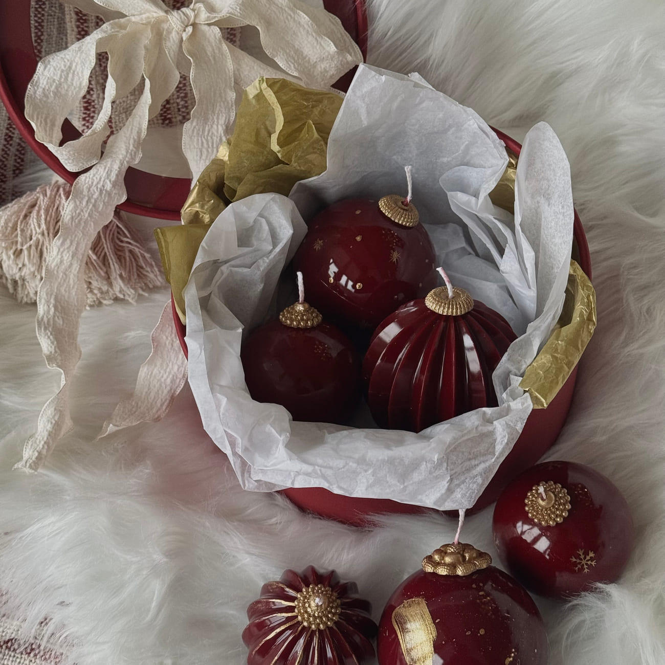 Создайте элегантную новогоднюю атмосферу с набором из трёх свечей в виде праздничных шаров. Глубокий тёмно-красный цвет символизирует уют и праздник, а изящный золотой декор добавляет шика и торжественности.