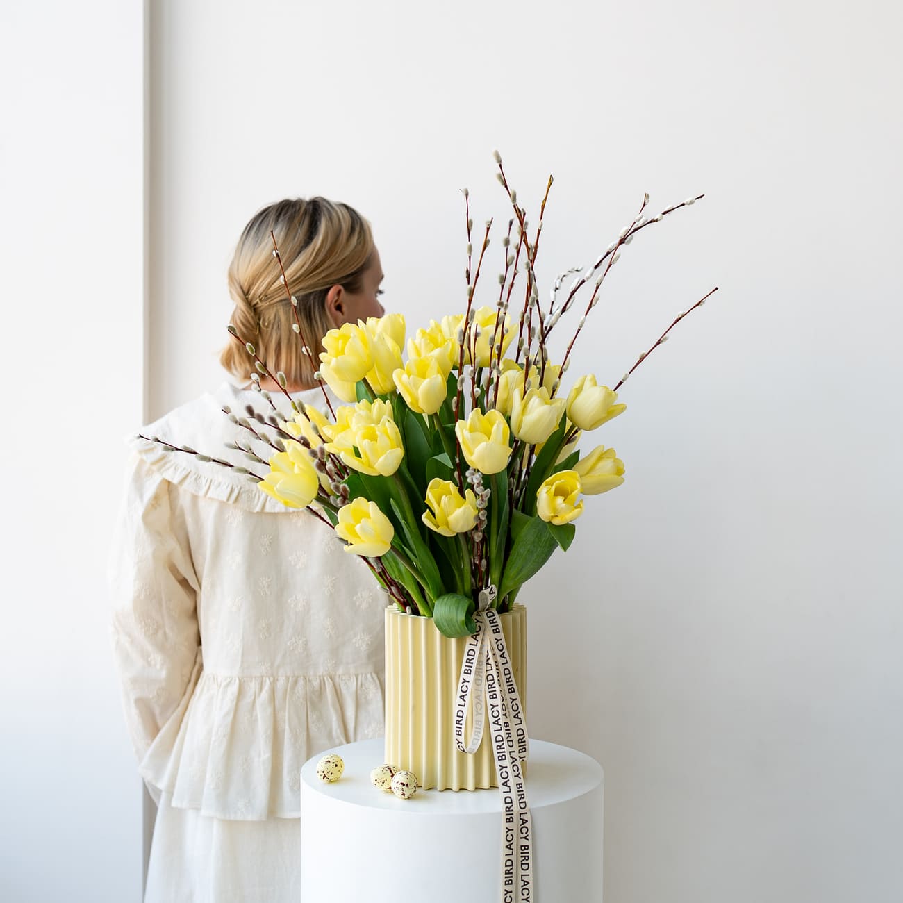 Букет из желтых тюльпанов и вербы — это живой символ весны и Пасхи. Такой дуэт подойдет для украшения пасхального стола, а керамическая ваза потом останется у вас как воспоминание этого светлого момента.