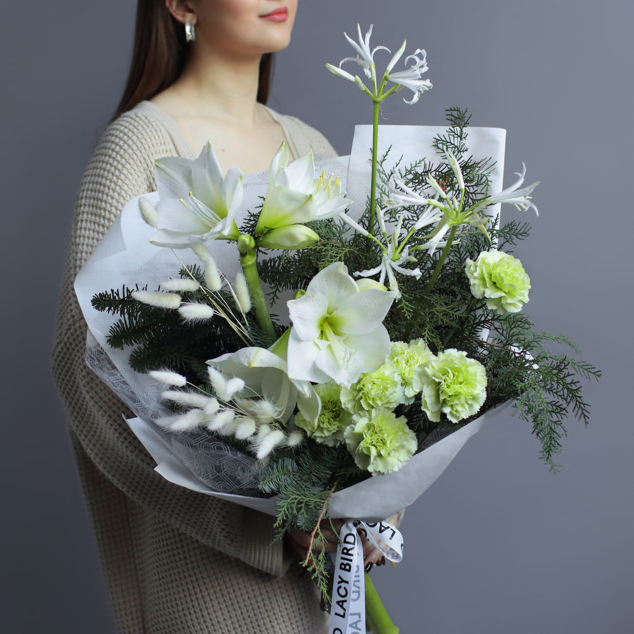 Свежие цветы от Lacy Bird доставляются в фирменной упаковке, которую необходимо снять при установке в вазу. Не срезайте ленту, связывающую букет для сохранения формы.