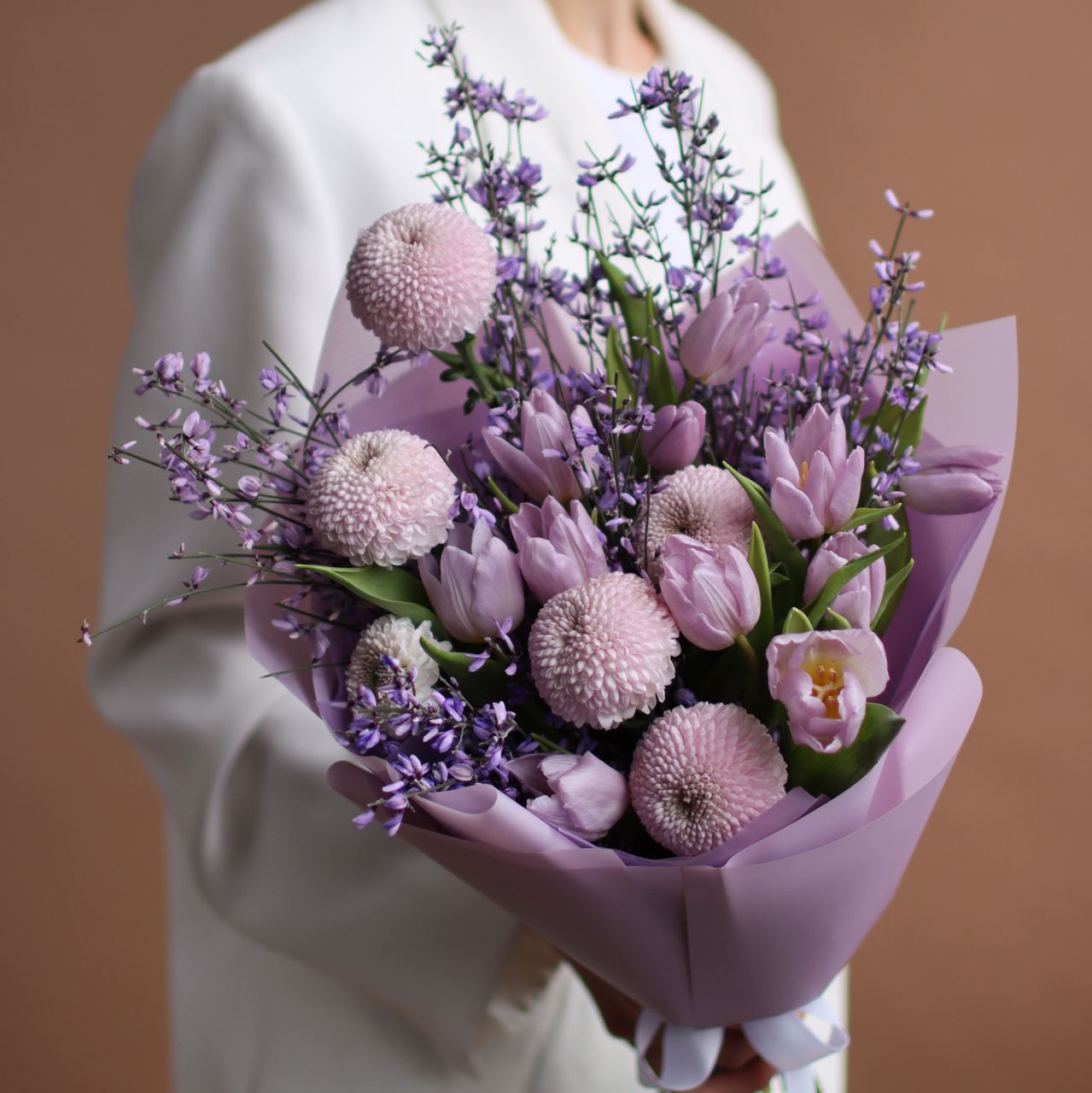 Свежие цветы от Lacy Bird доставляются в фирменной упаковке, которую необходимо снять при установке в вазу. Не срезайте ленту, связывающую букет для сохранения формы.