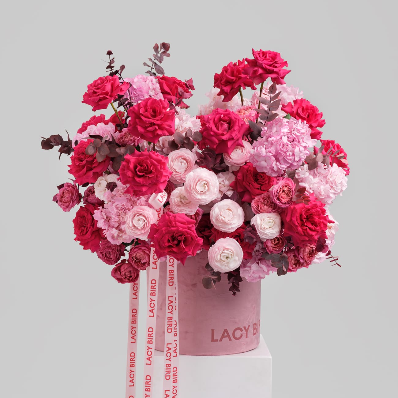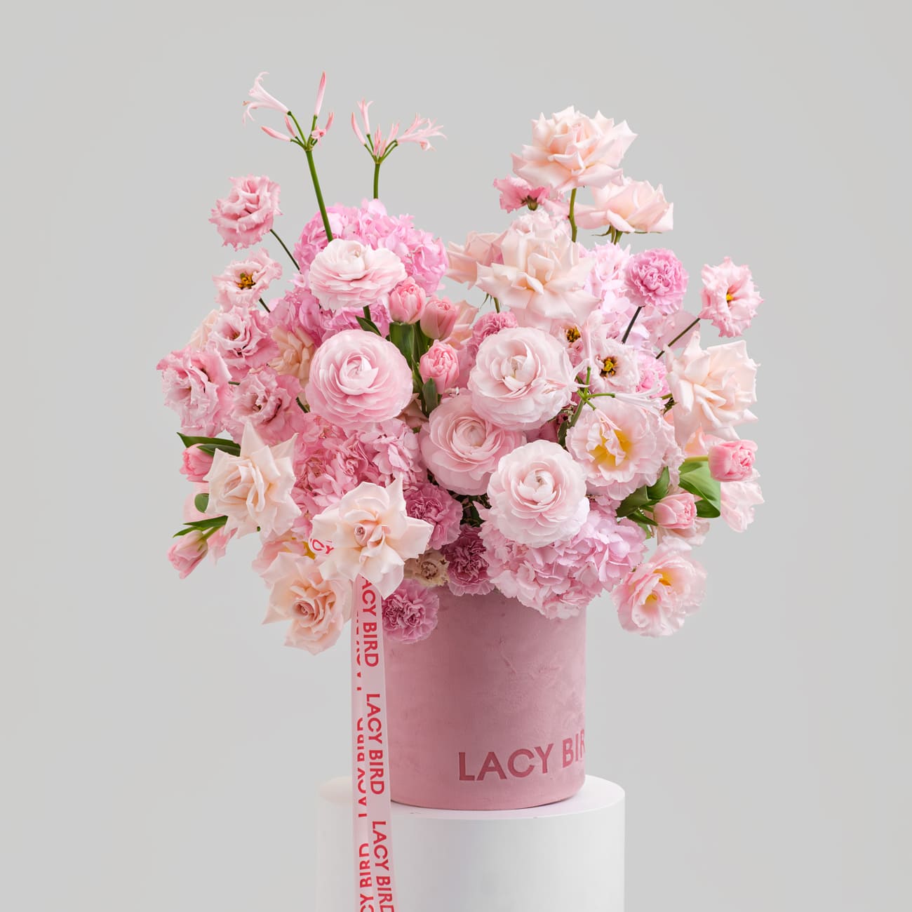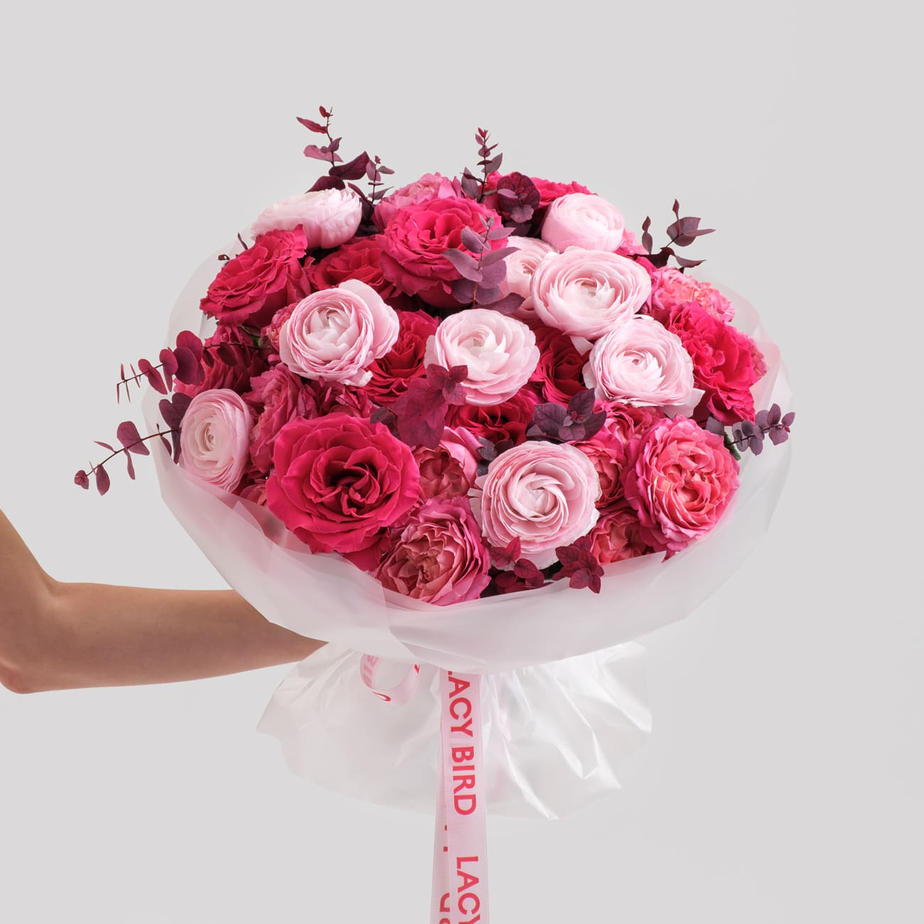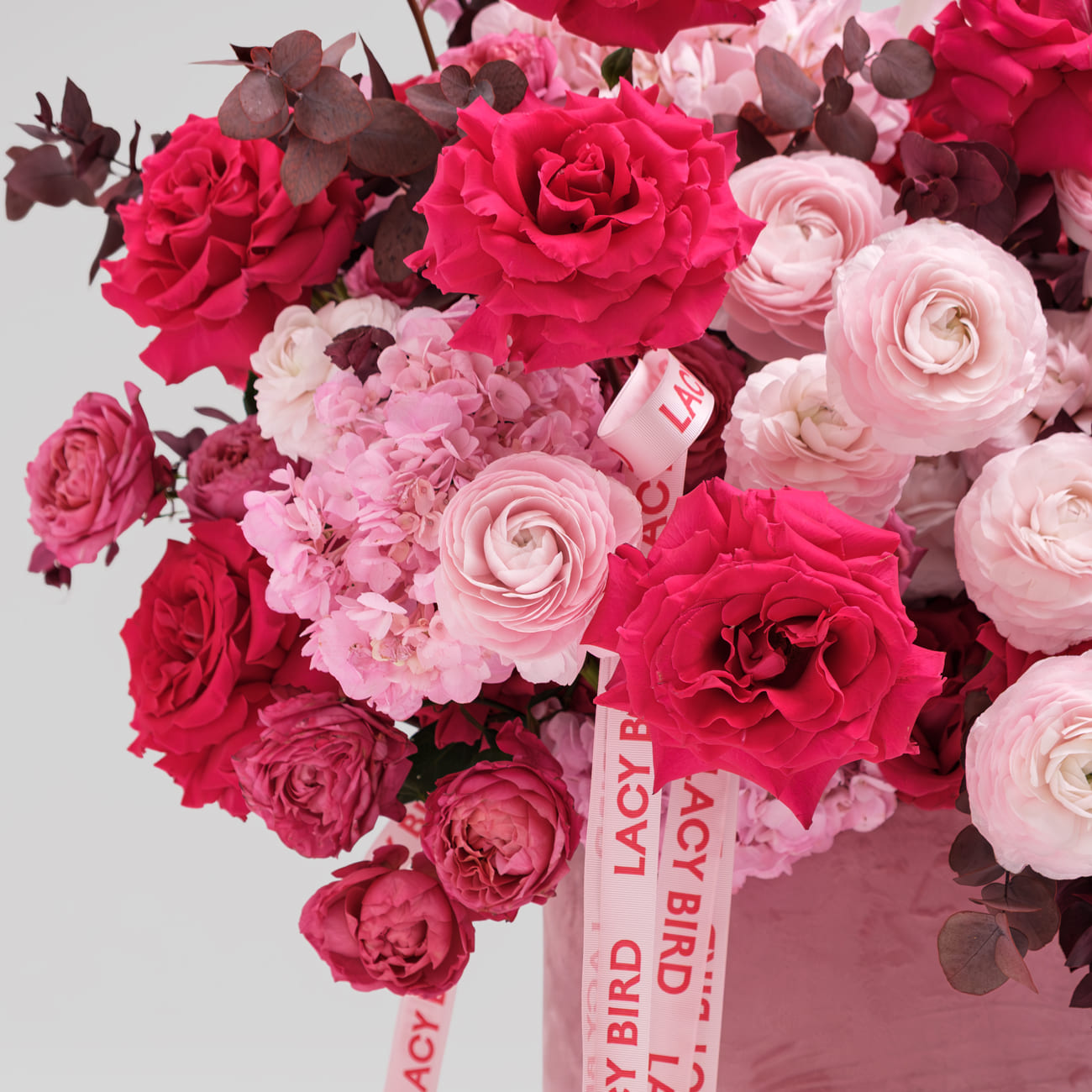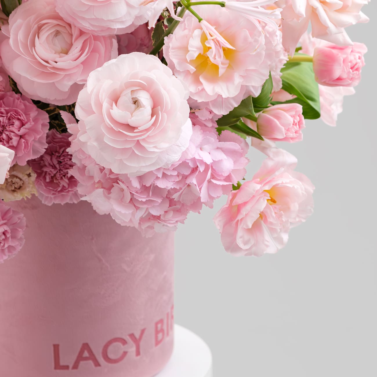 Свежие цветы от Lacy Bird доставляются в фирменной упаковке, которую необходимо снять при установке в вазу. Не срезайте ленту, связывающую букет для сохранения формы.
