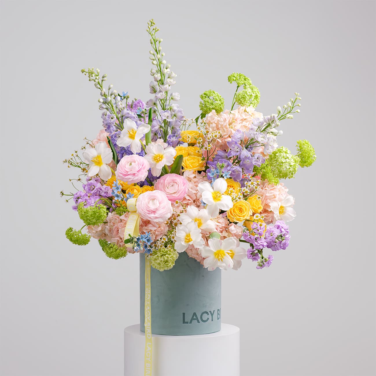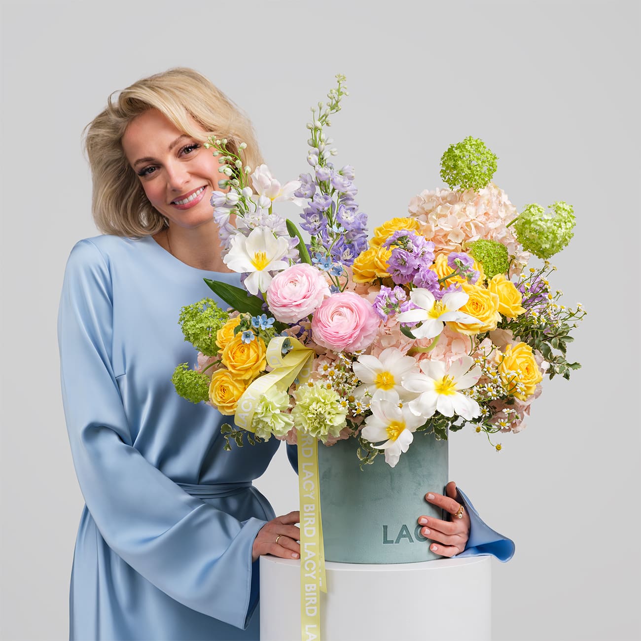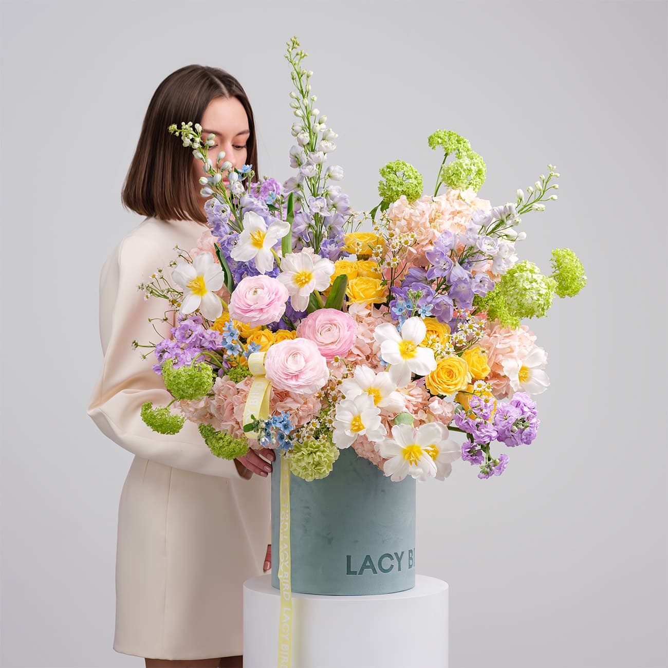 Свежие цветы от Lacy Bird доставляются в фирменной упаковке, которую необходимо снять при установке в вазу. Не срезайте ленту, связывающую букет для сохранения формы.
