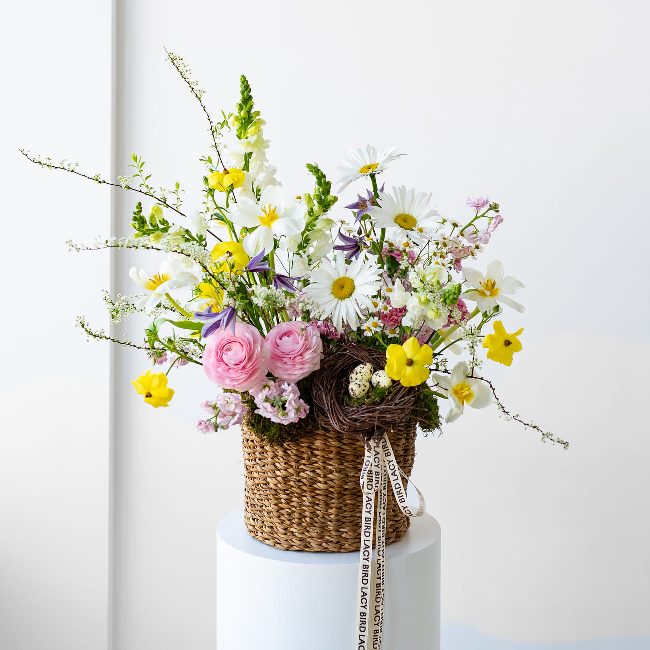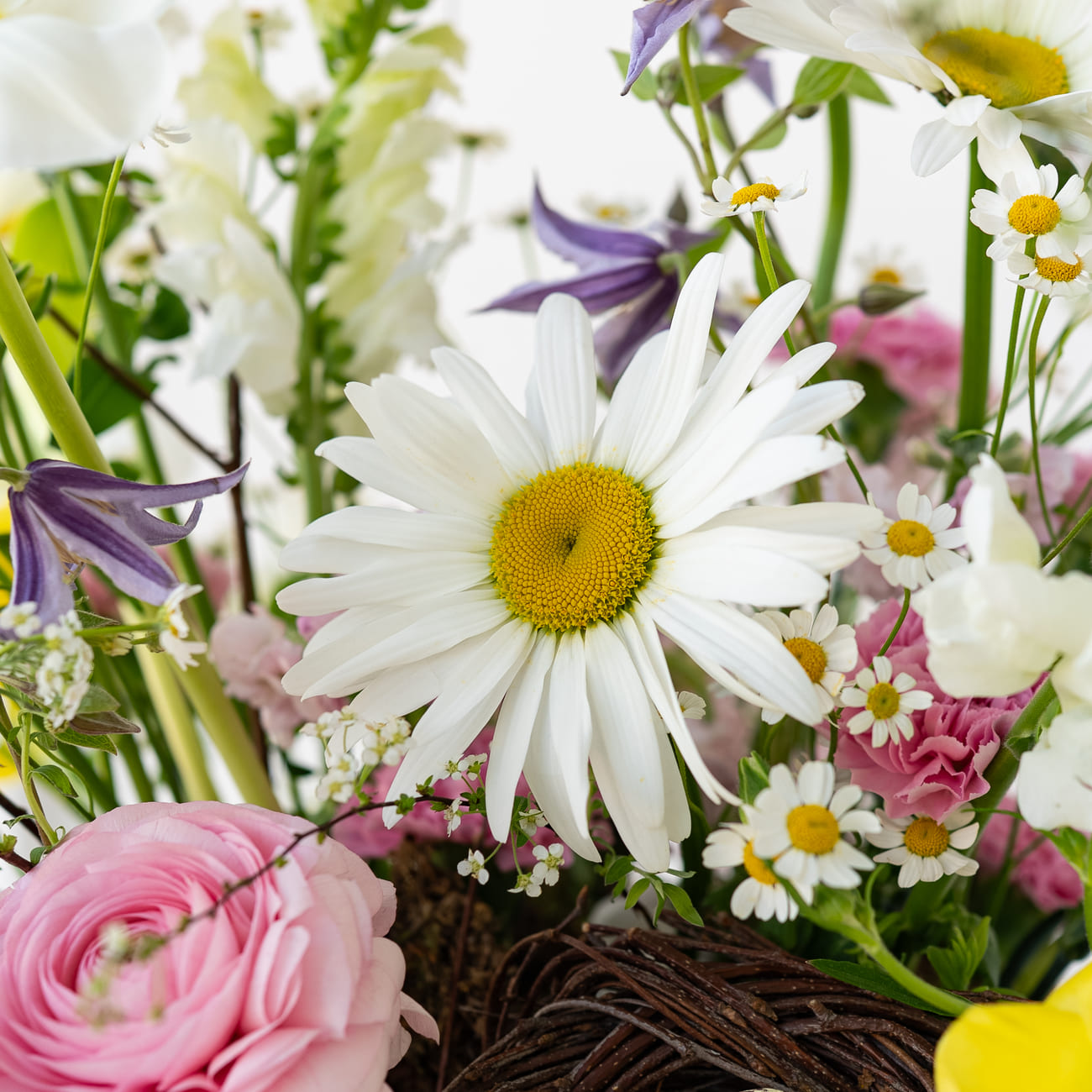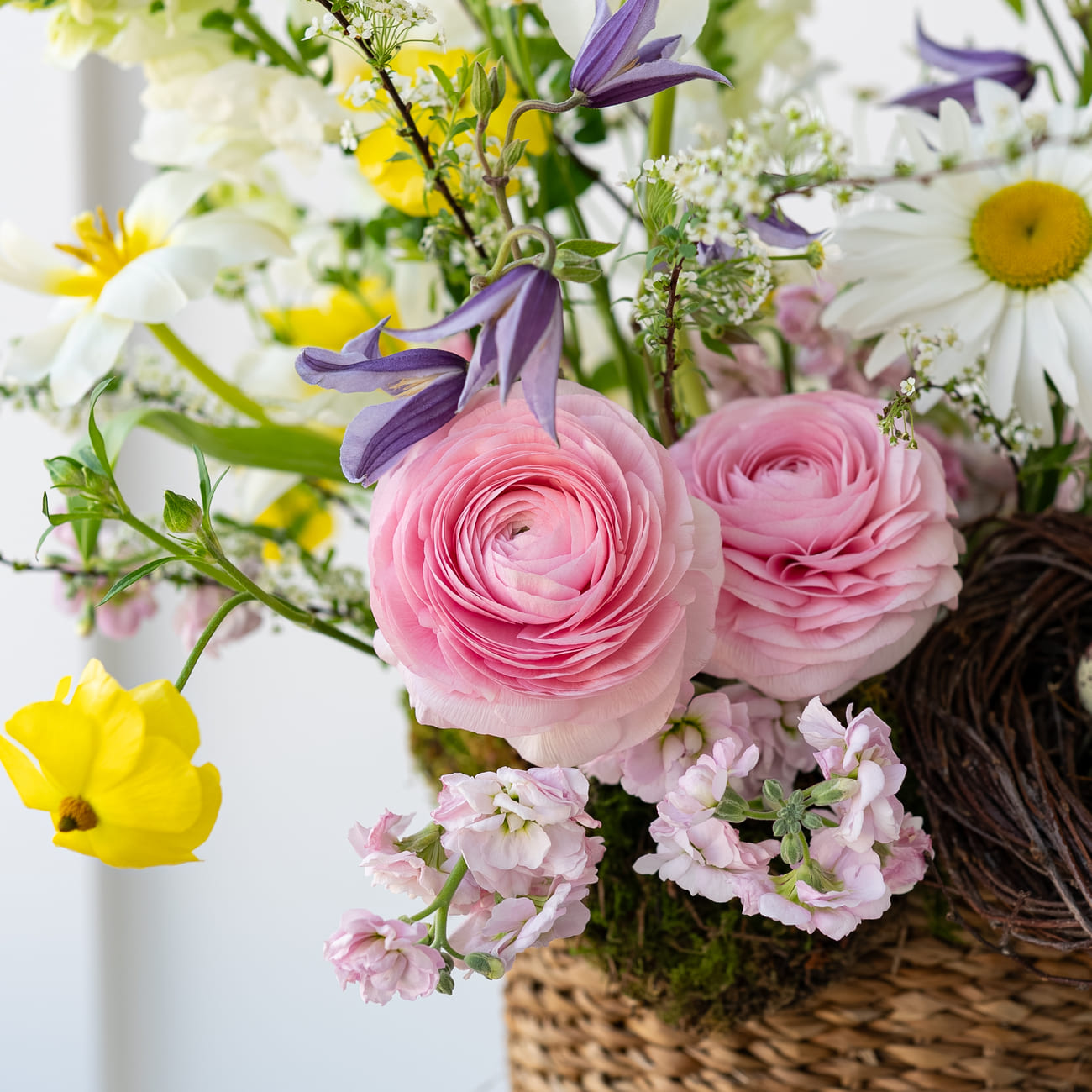 Эта корзина из натурального рогоза представляет собой нежную природную композицию. В корзине собраны ранункулюсы, ромашки, маттиола, клематис и веточки спиреи.