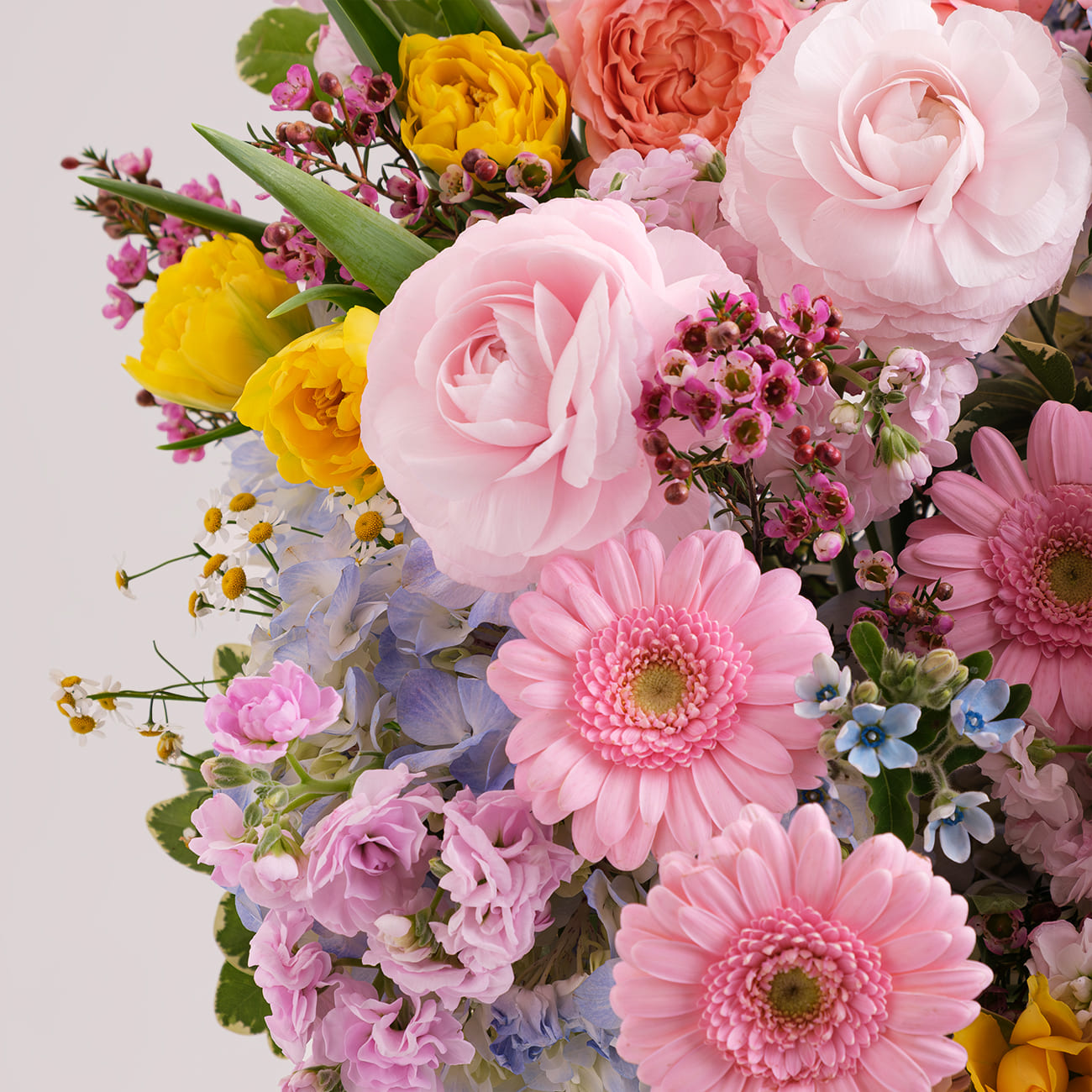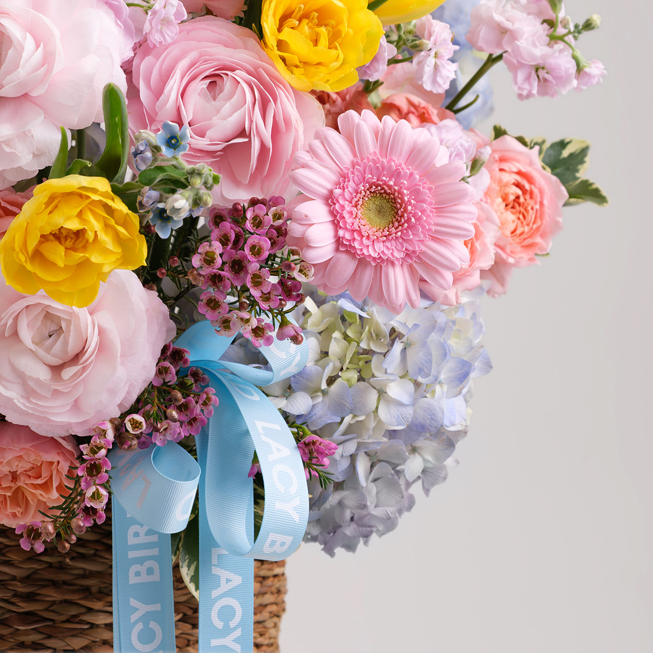 Праздничное настроение с корзиной «Эйфория» из коллекции «Гормоны счастья»! Уникальная палитра розовых, жёлтых и голубых оттенков от роз, гербер и гортензий создает атмосферу радости и волшебства. Плетеная корзина и изящная голубая ленточка добавляют утонченность.