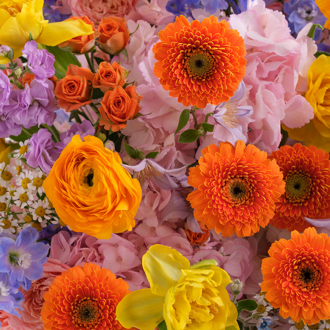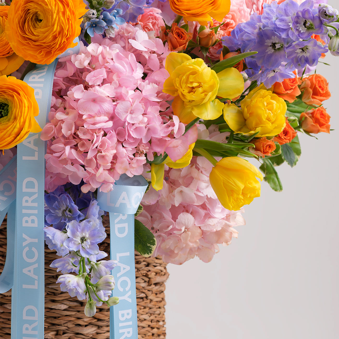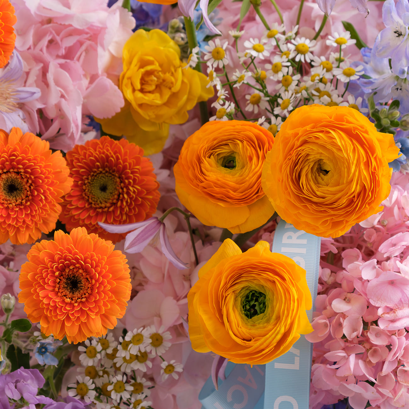 Подарите весеннее настроение с корзиной «Феерия» из коллекции «Гормоны счастья». Это жизнеутверждающее сочетание ранункулюсов, гербер, гортензий и клематисов, в ярких оранжевых, жёлтых, розовых, голубых и фиолетовых тонах создаёт атмосферу праздника и радости. Изящные ленточки добавляют элегантности, делая эту корзину идеальным подарком для самых близких.