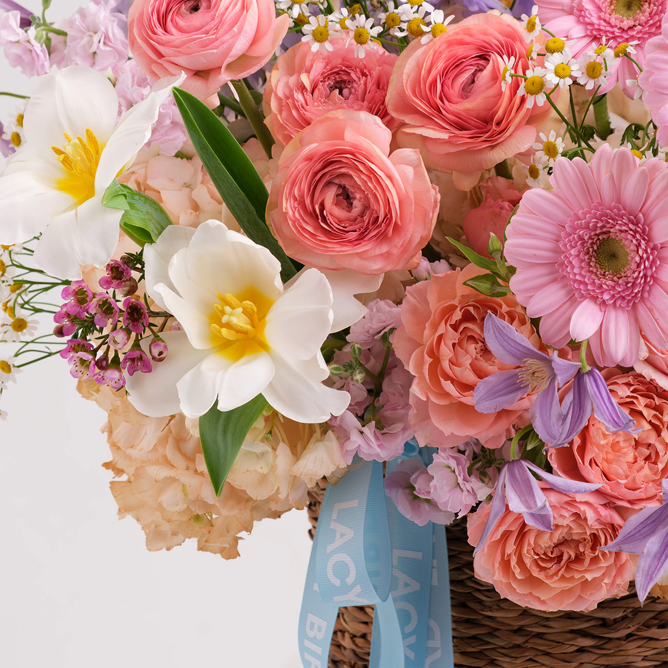 Подарите мелодию чувств с корзиной «Гармония» из коллекции «Гормоны счастья». В этой изысканной композиции герберы и ранункулюсы переплетаются с дельфиниумом, гортензиями и клематисом, создавая волшебную палитру розовых, персиковых, фиолетовых и белых оттенков. Элегантная плетеная корзина и голубая ленточка придают утонченность и стиль.