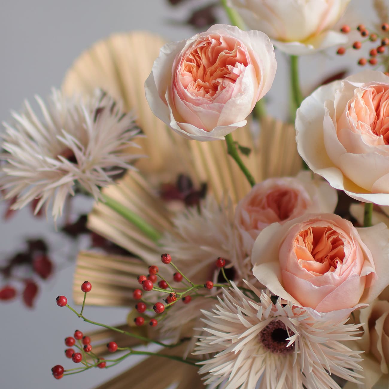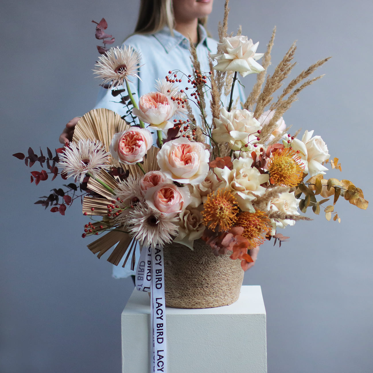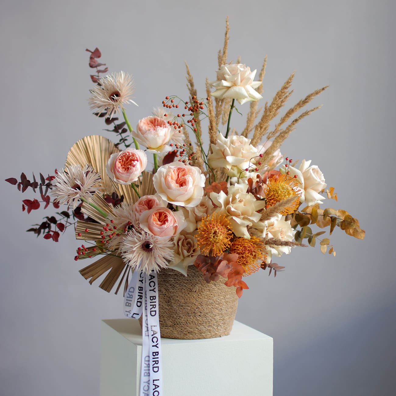 Почувствуйте тепло и уют "Теплого вечера" с нашей эксклюзивной цветочной корзиной. Изящное сочетание персиковых и кремовых роз, дополненное пушистыми сухоцветами и экзотическими листьями, создает завораживающую гармонию текстур и цветов.
