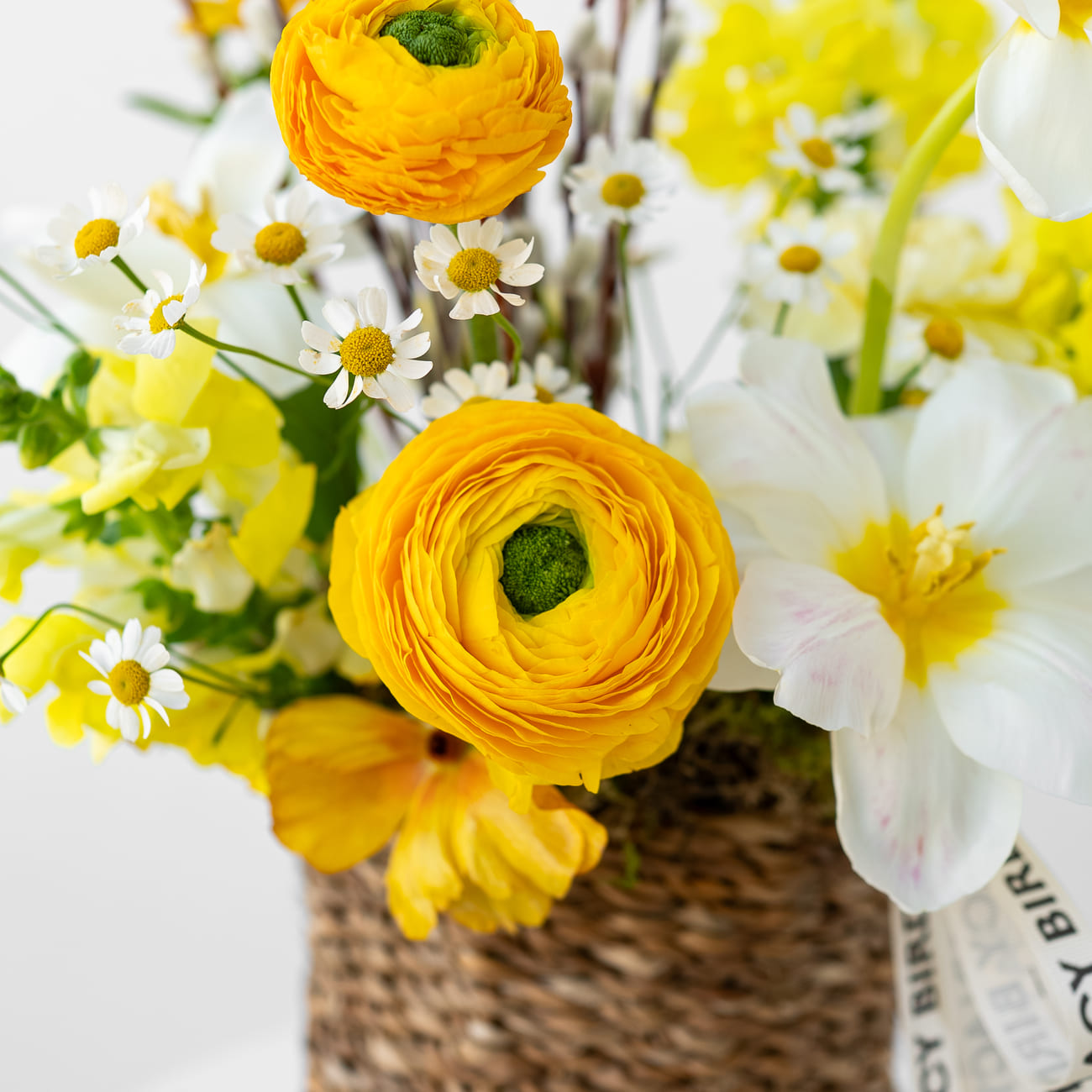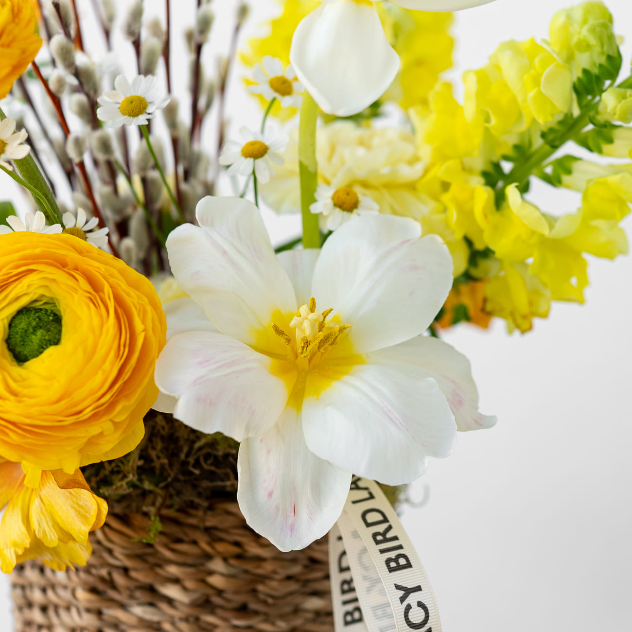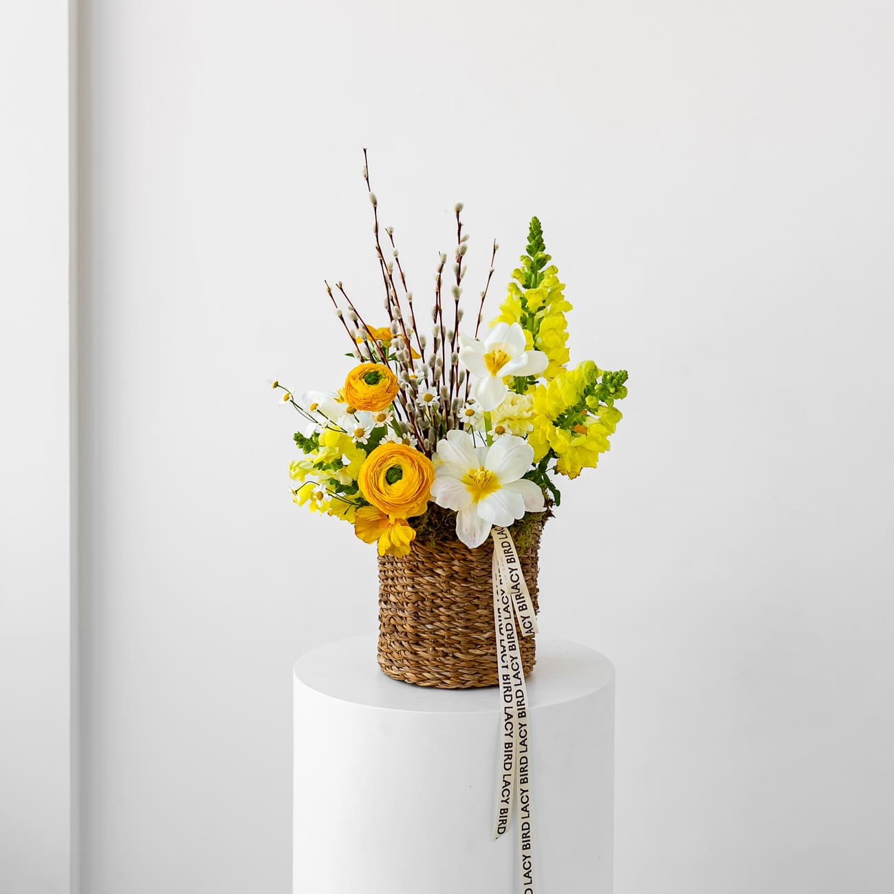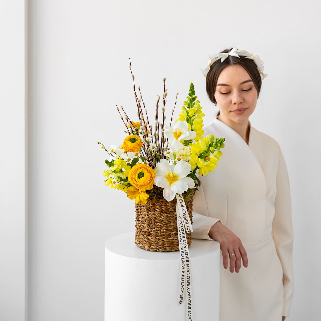 Свежие цветы от Lacy Bird доставляются в фирменной упаковке, которую необходимо снять при установке в вазу. Не срезайте ленту, связывающую букет для сохранения формы.