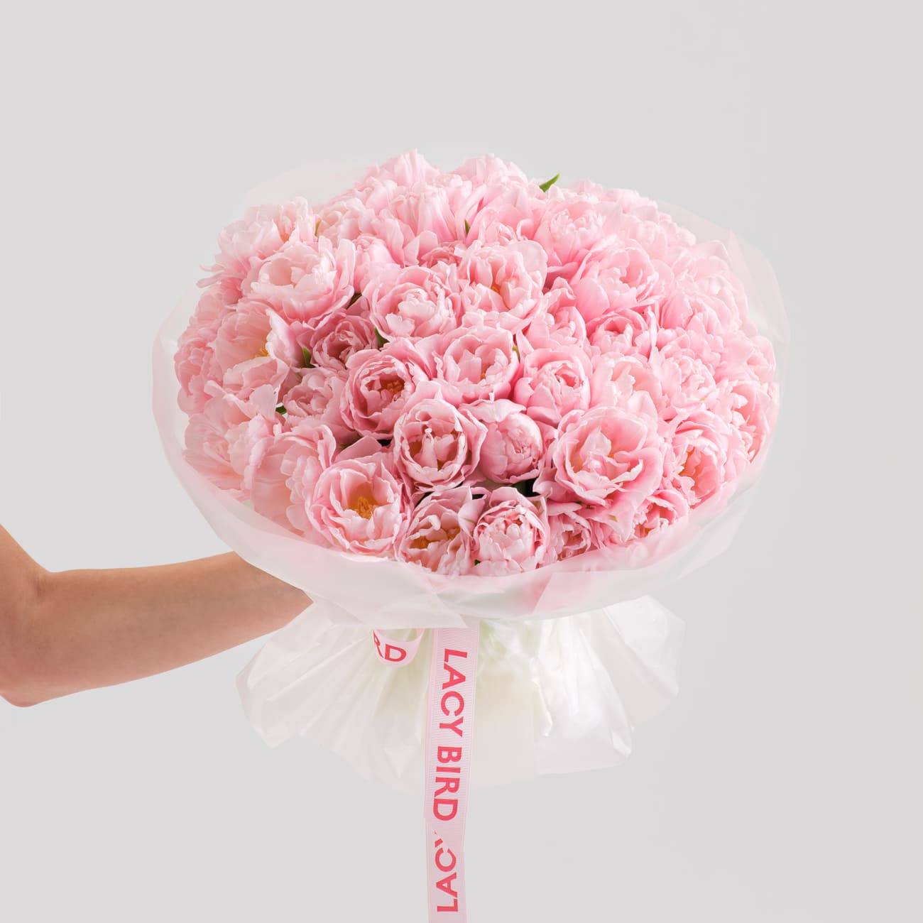 Свежие цветы от Lacy Bird доставляются в фирменной упаковке, которую необходимо снять при установке в вазу. Не срезайте ленту, связывающую букет для сохранения формы.
