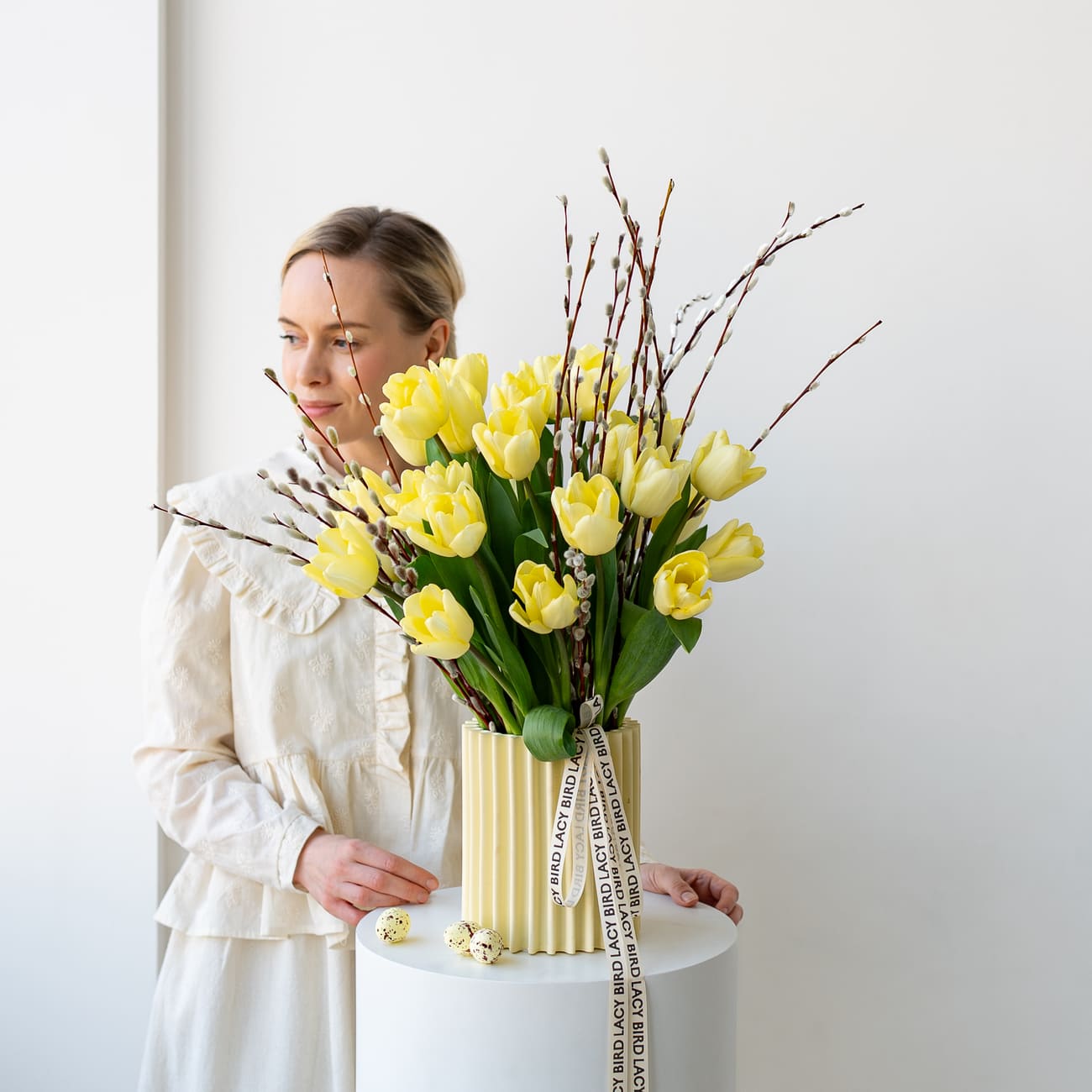 Букет из желтых тюльпанов и вербы — это живой символ весны и Пасхи. Такой дуэт подойдет для украшения пасхального стола, а керамическая ваза потом останется у вас как воспоминание этого светлого момента.