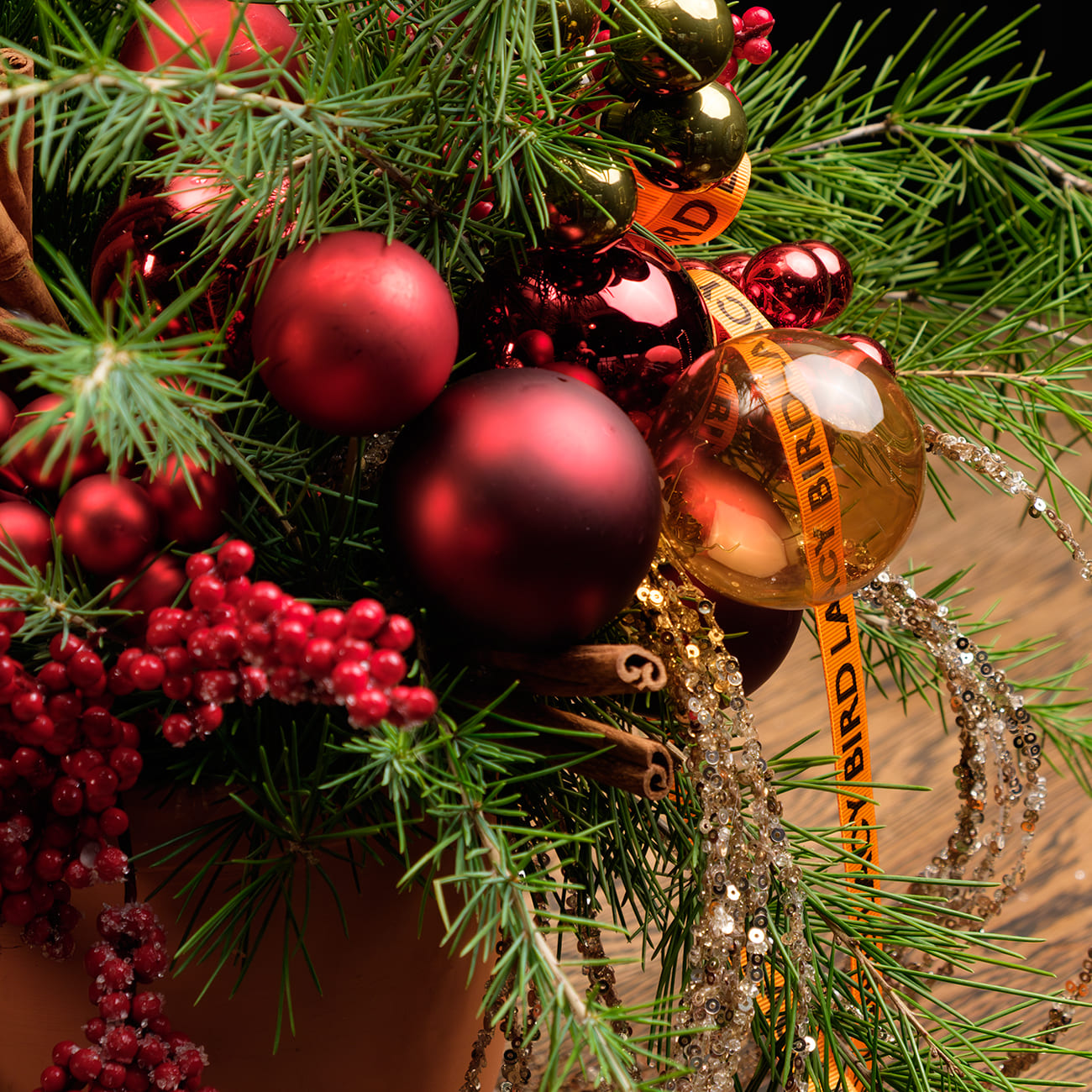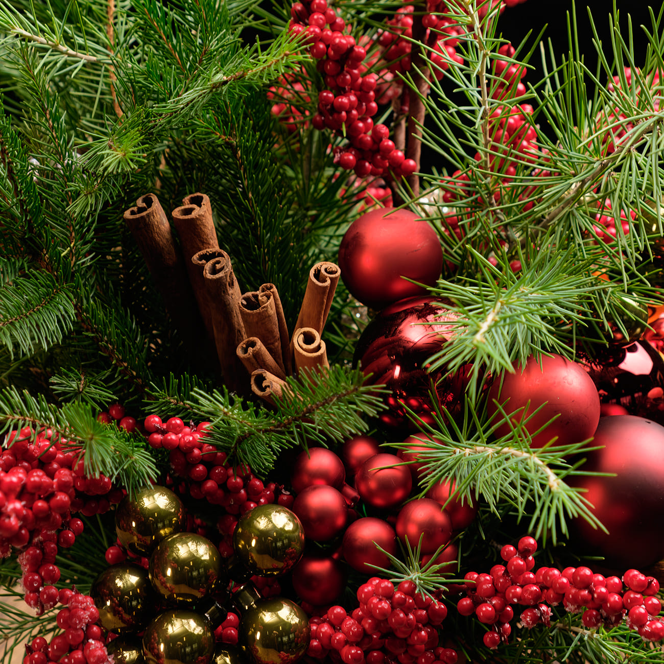 Погрузитесь в атмосферу праздника с нашей композицией из коллекции «Пряности и сладости». Она создана из живой хвои разных видов, украшена стеклянными игрушками в теплых оттенках бордового и дополнена искусственными ветками с алыми ягодами и пайетками. Корица добавляет уют и напоминает о запахе зимних специй.