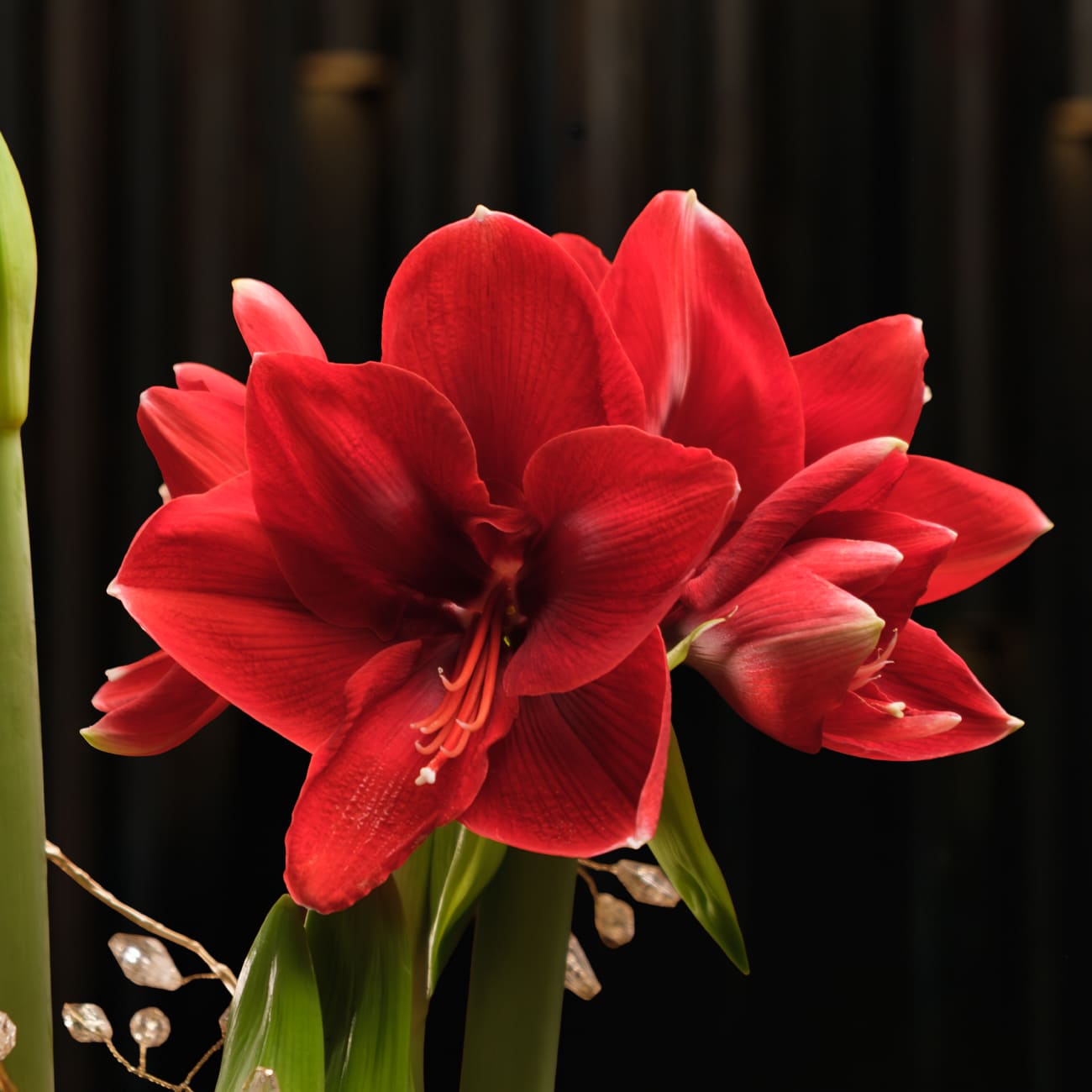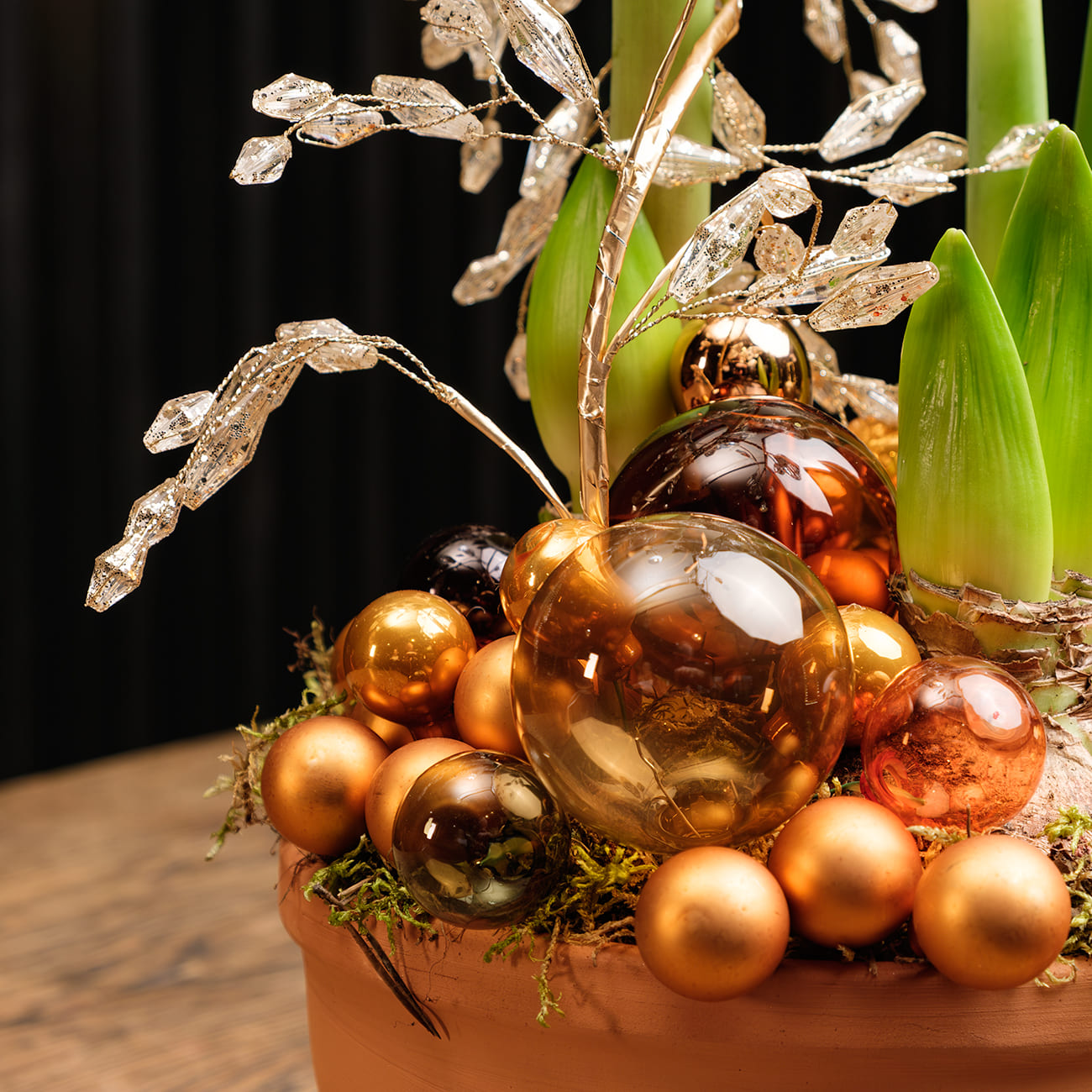 Погрузитесь в атмосферу праздника с нашей композицией из коллекции «Пряности и сладости». Луковичные амариллисы, украшенные стеклянными шарами и веткой с кристаллами, будут радовать вас своим цветением до месяца, даря праздничное настроение всем, кто их увидит.
