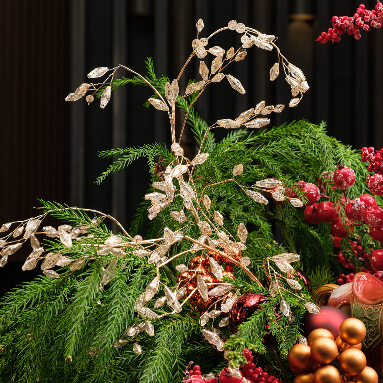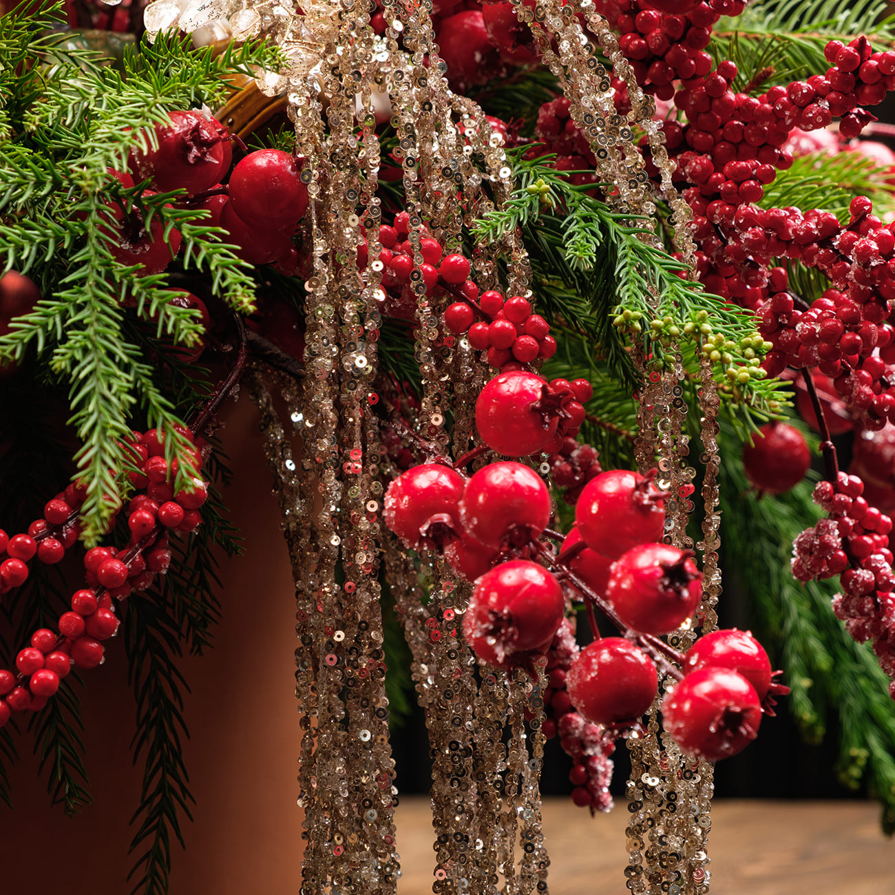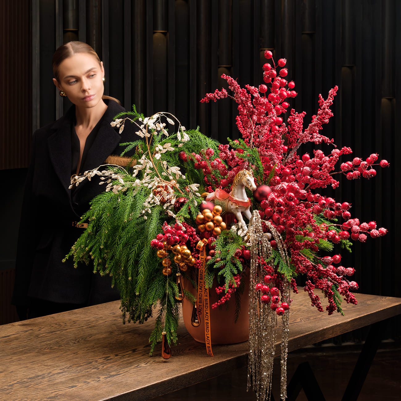 Погрузитесь в атмосферу праздника с нашей композицией из коллекции «Пряности и сладости». Она создана из живой хвои, украшена стеклянными игрушками в теплых оттенках бордового, золотого и дополнена искусственными ягодами сочного красного цвета.