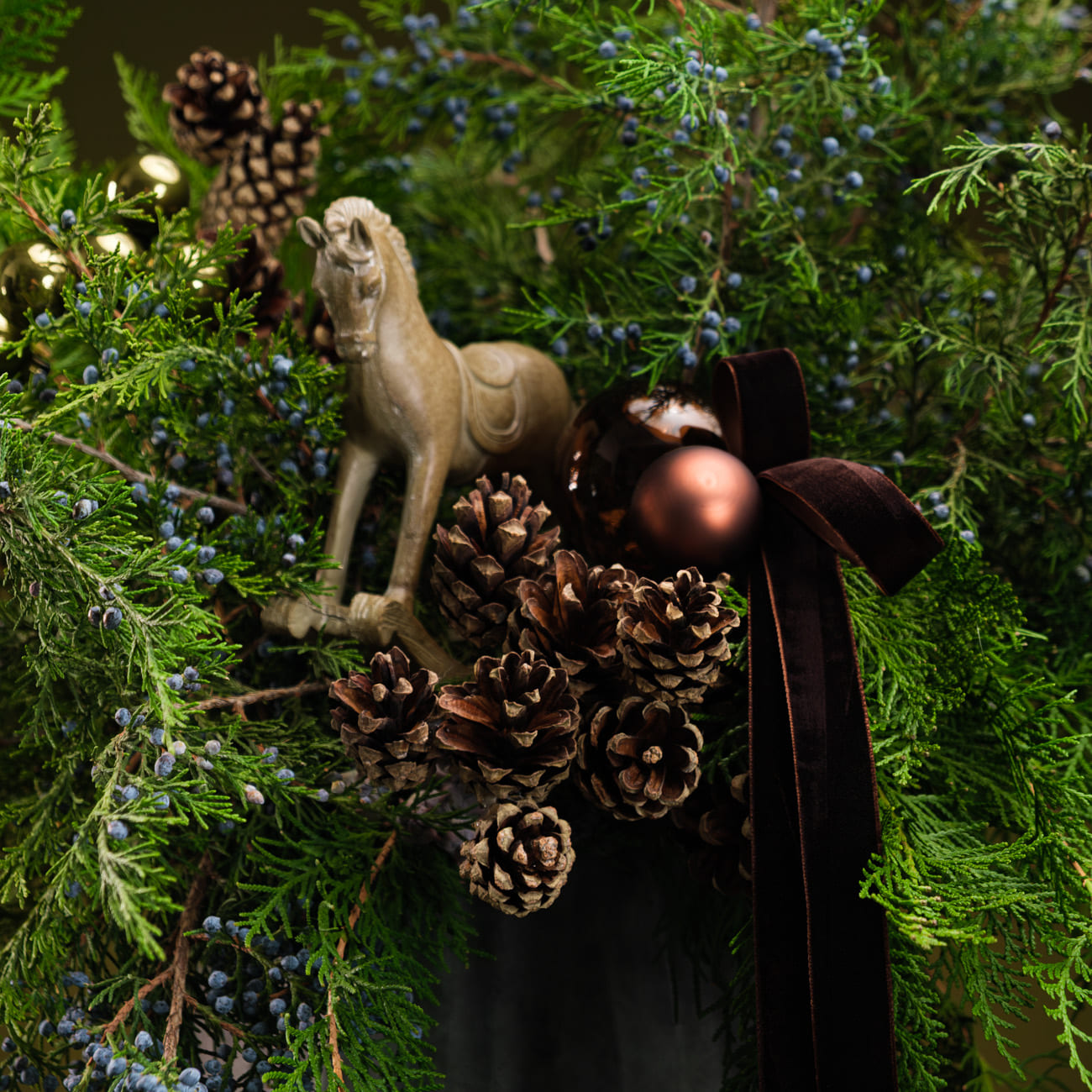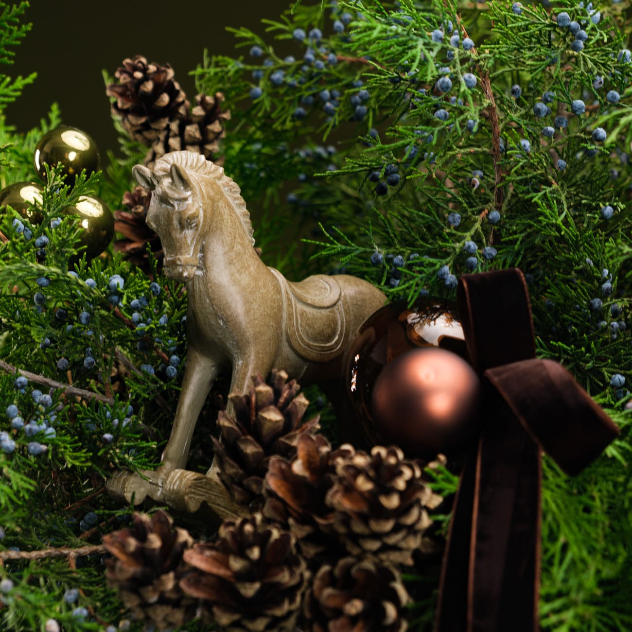 Композиция создана из живой хвои разных видов, натуральных шишек. Декорирована стеклянными шарами коричневых, зеленых оттенков, бархатной лентой и фигуркой лошадки.