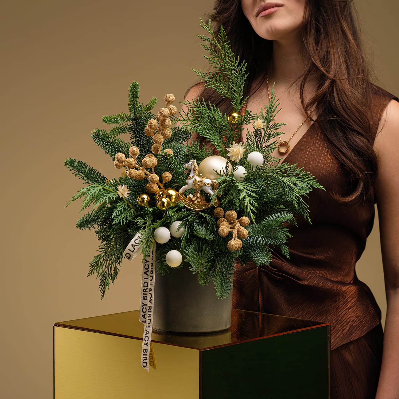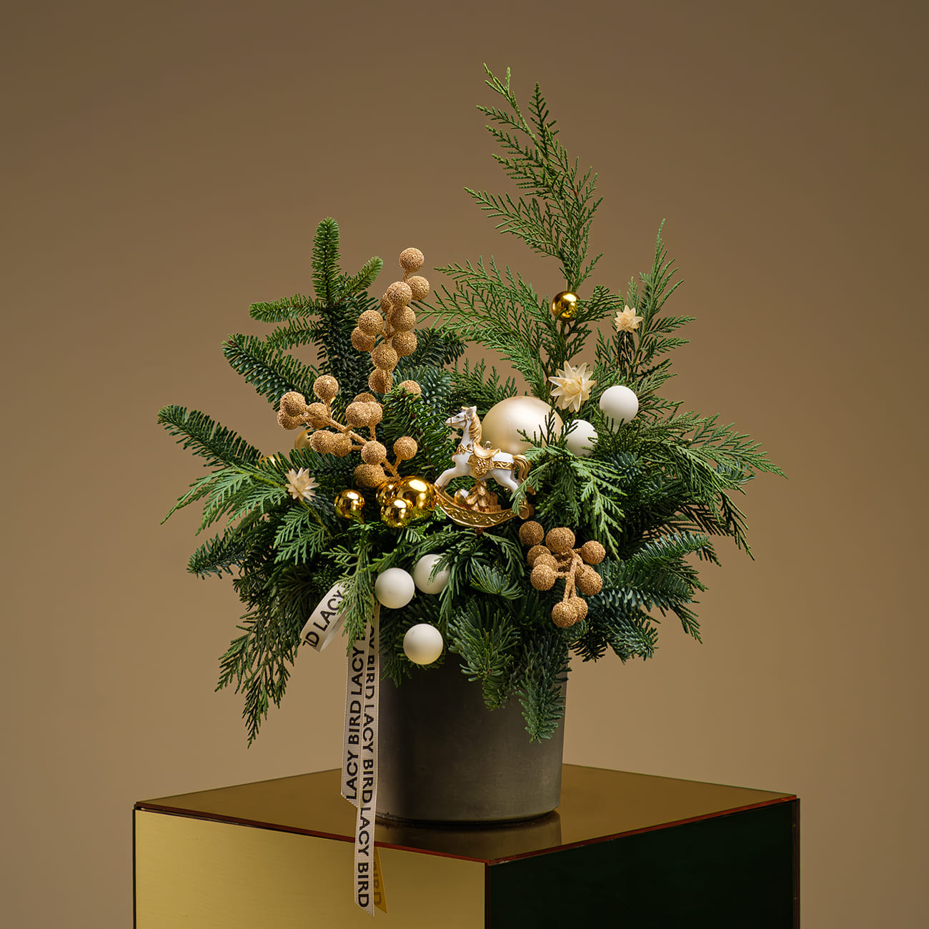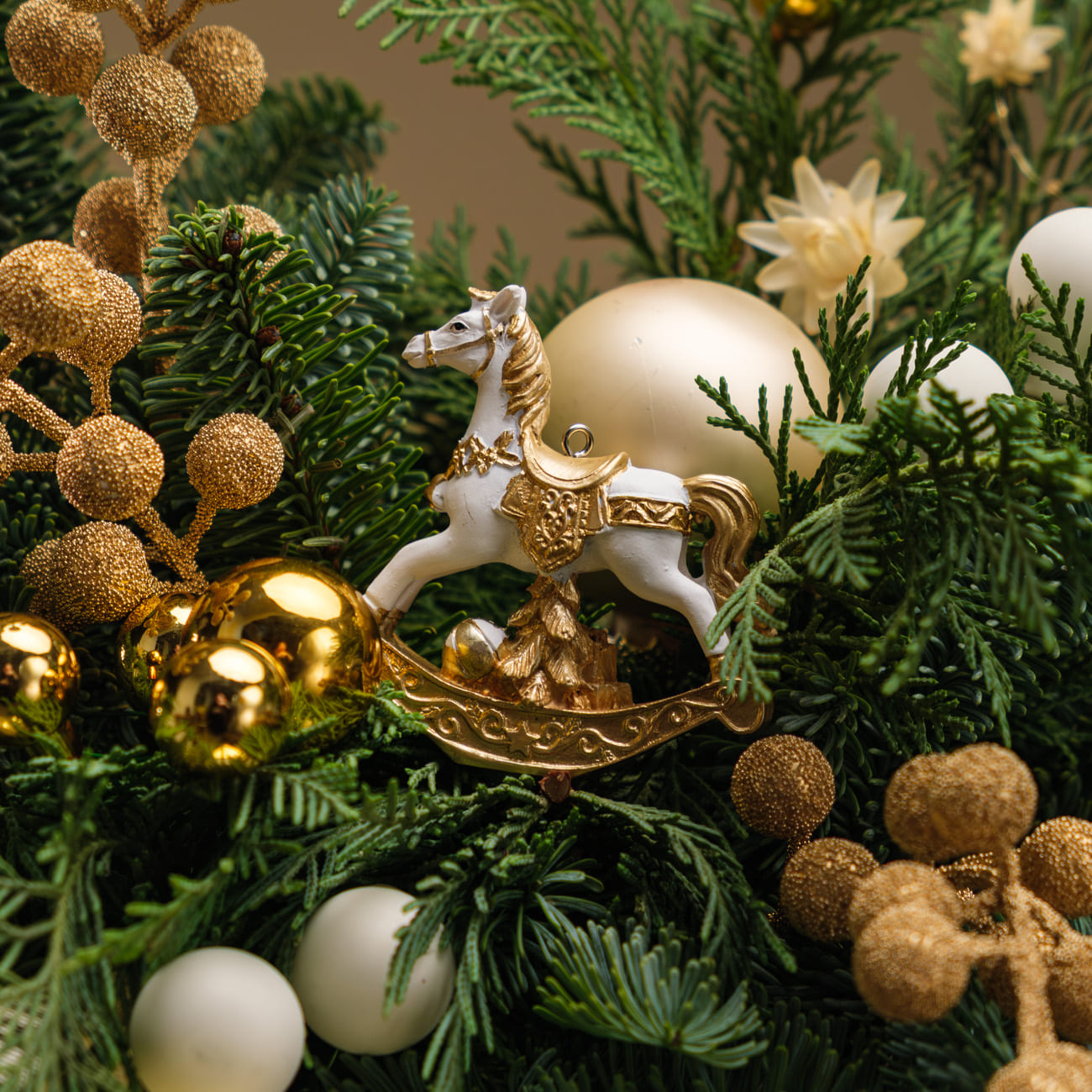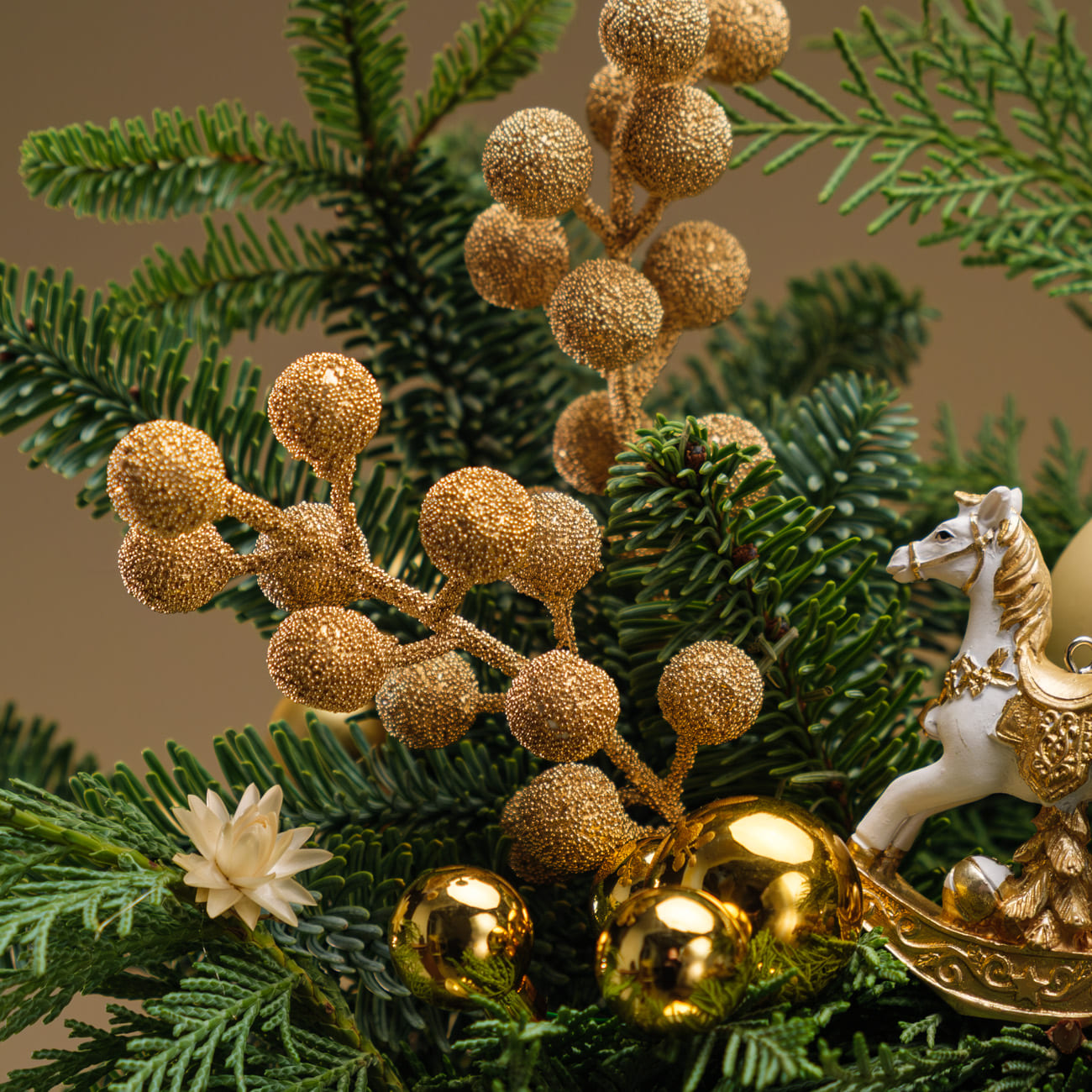 Она создана из живой хвои разных видов, украшена стеклянными шарами благородного золотого и белого цветов. А сахарные ягоды и фигурка лошадки добавляют композиции особое очарование.