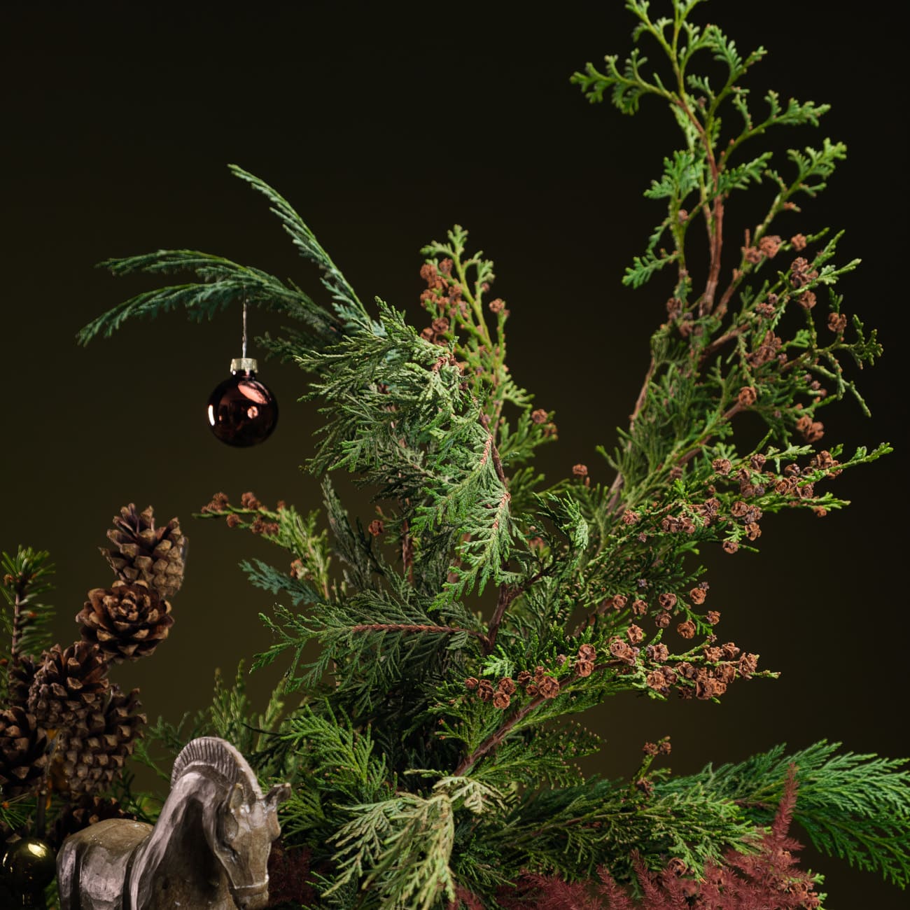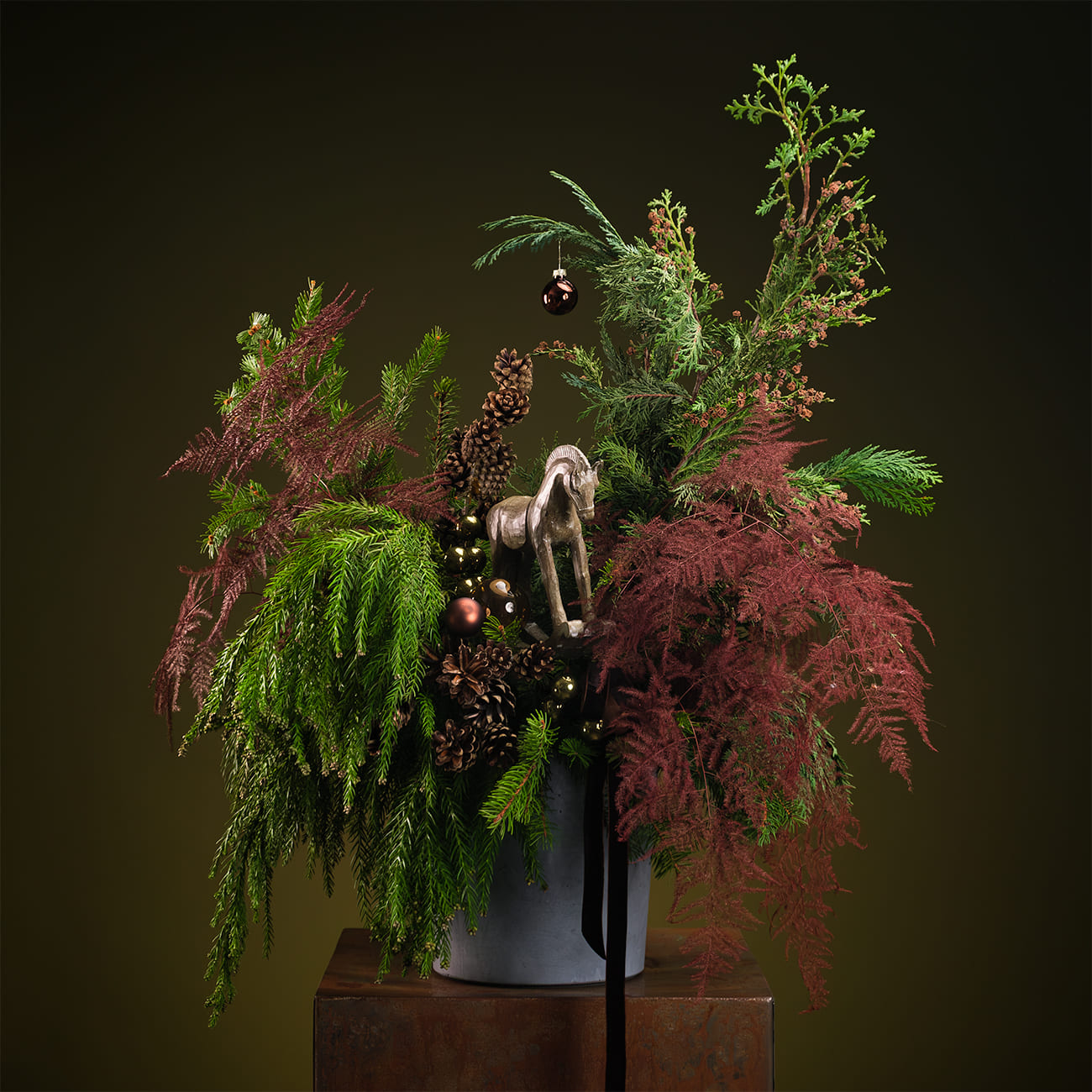 Композиция создана из живой хвои разных видов, натуральных шишек и веток аспарагуса цвета марсала. Декорирована прозрачными стеклянными шарами коричневых оттенков, бархатной лентой и фигуркой лошади.
