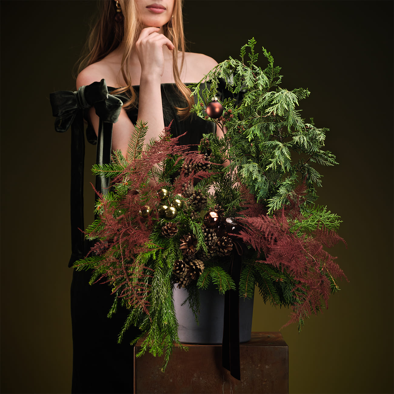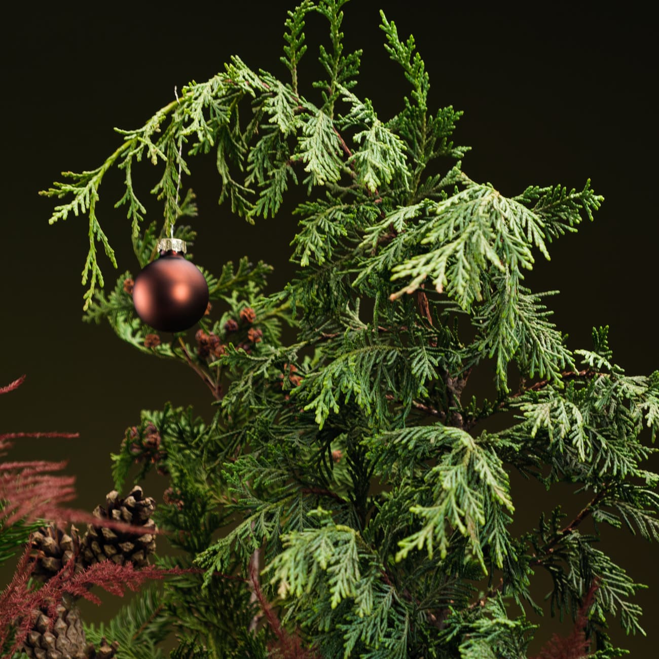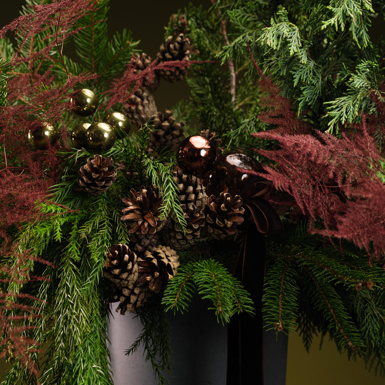 Композиция создана из живой хвои разных видов, натуральных шишек и веток аспарагуса цвета марсала. Декорирована стеклянными шарами коричневых, зеленых оттенков и бархатной лентой.