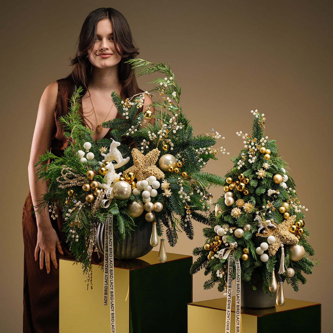 Он создан из живой хвои разных видов, украшен стеклянными шарами благородного золотого и белого цветов. Звезды, декорированные россыпью жемчужных бусин, ветки с кристаллами и фигурки лошадок добавляют композициям особое очарование. А свечи в форме лошадок будет прекрасным украшением вашего интерьера и привнесут тепло в холодные зимние вечера.