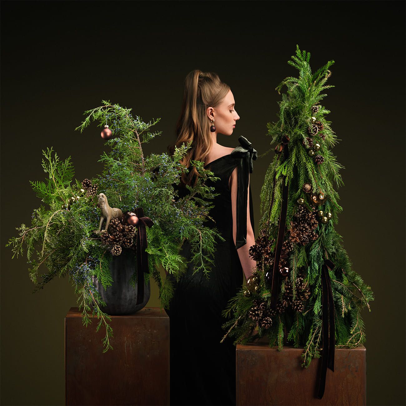 Композиции созданы из живой хвои разных видов, натуральных шишек и веток аспарагуса цвета марсала. Декорированы стеклянными шарами коричневых, зеленых оттенков и фигуркой лошадки.
