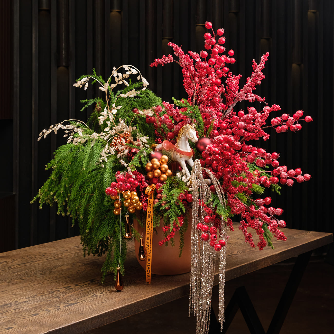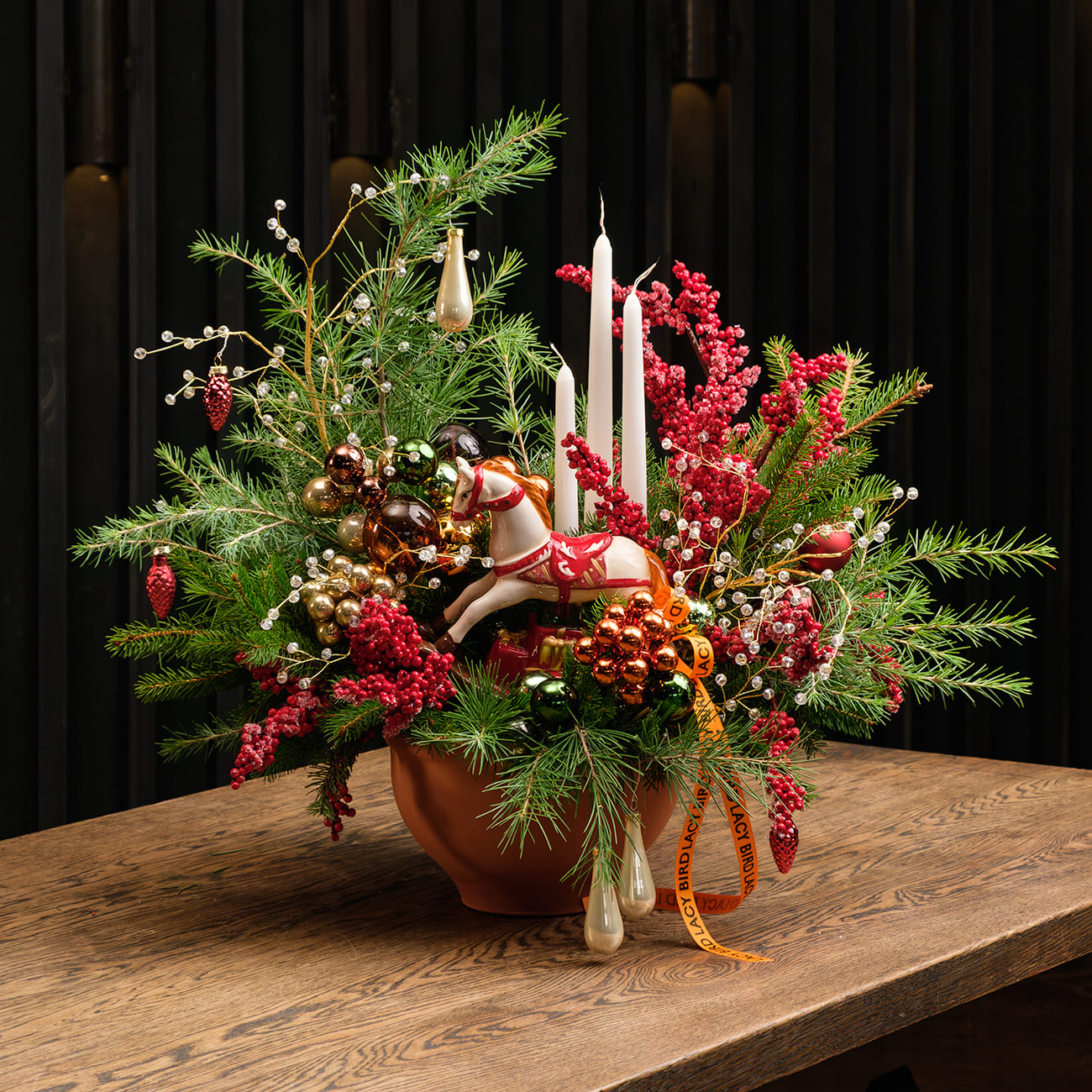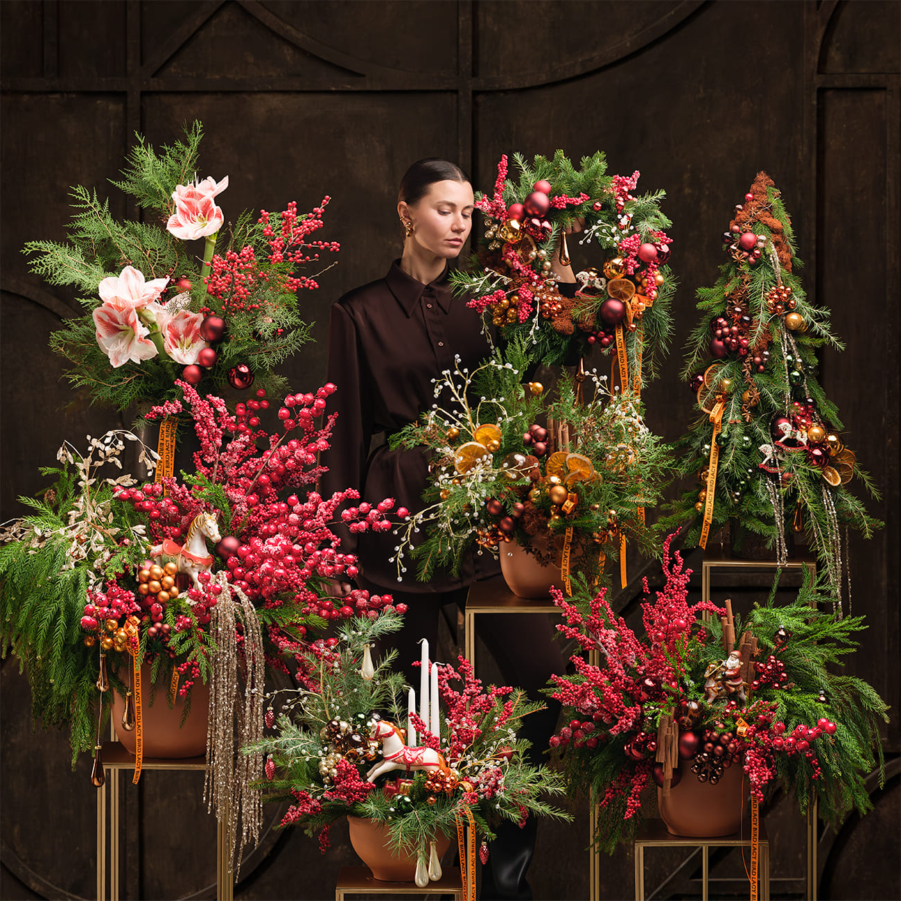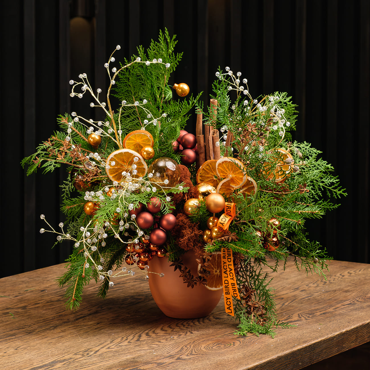 Погрузитесь в атмосферу праздника с нашим сетом из коллекции «Пряности и сладости». Он создан из живой хвои, украшен стеклянными игрушками в теплых оттенках красного, шоколадного и золотого. Сияющие нити с пайетками и ветки с ягодами подчеркивают стиль и изысканность. А сушеные апельсины, корица и анисовые звездочки добавляют уют, напоминая о запахе зимних специй.