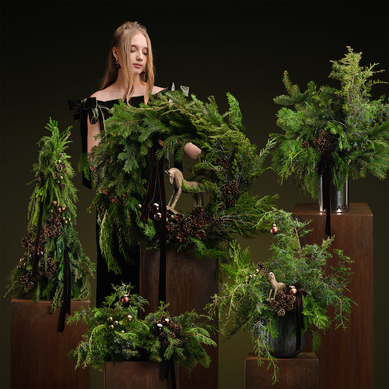 Композиции созданы из живой хвои разных видов и натуральных шишек. Декорированы стеклянными шарами коричневых, зеленых оттенков, бархатной лентой и фигуркой лошадки.