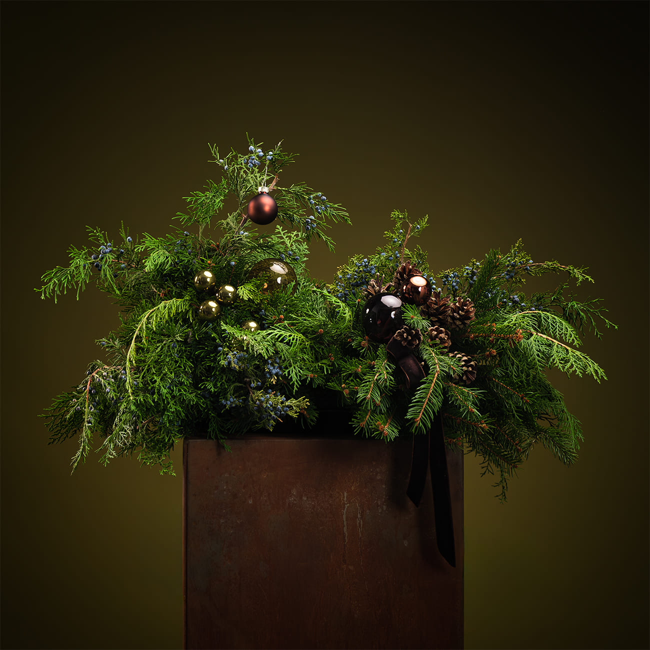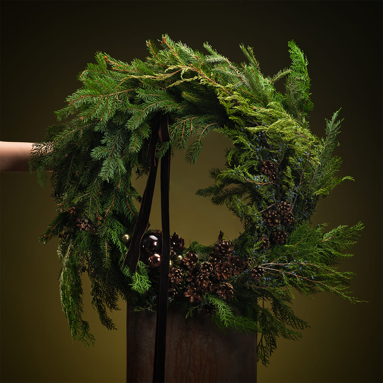 Состав: Елка L, композиция настольная, венок L, бидон M, композиция.