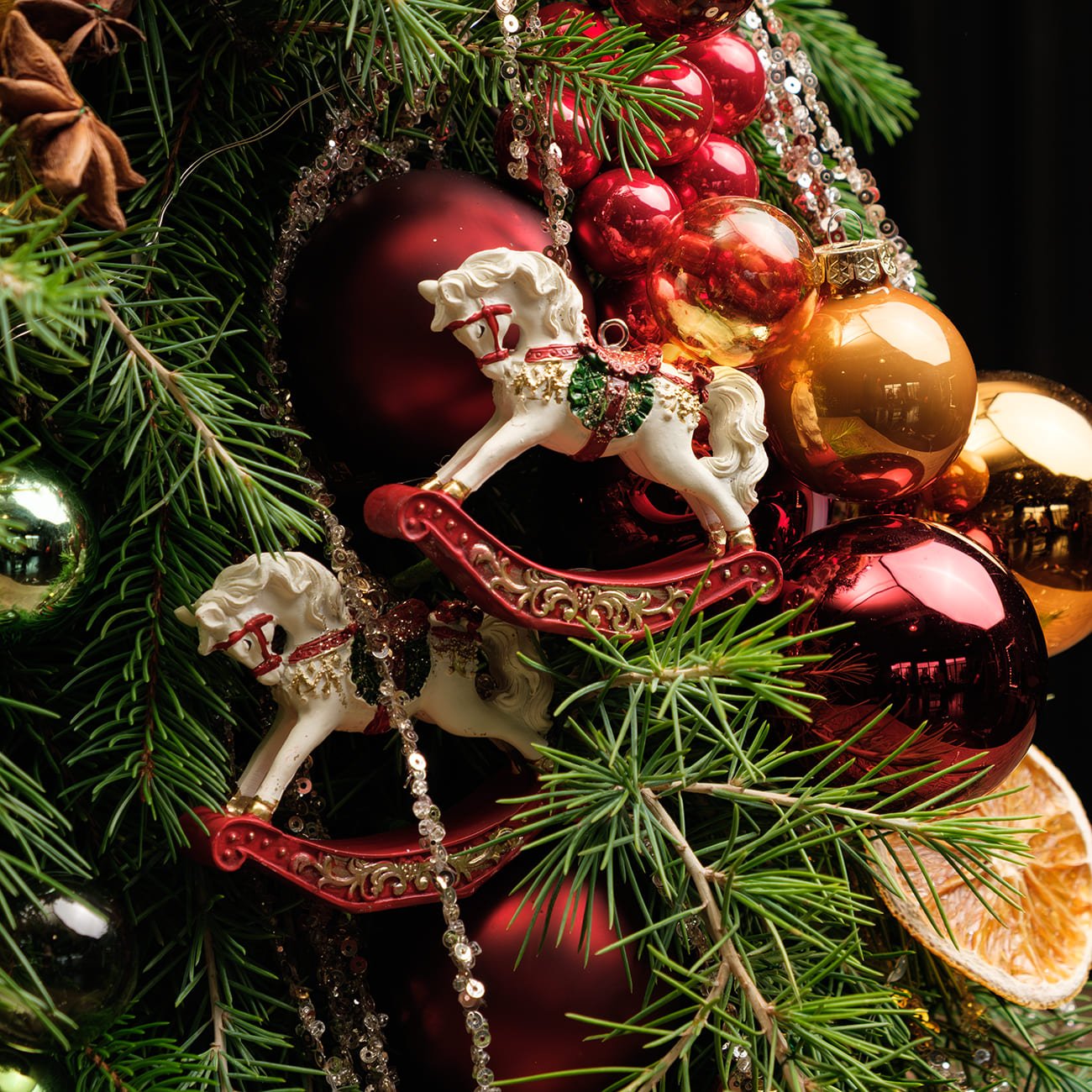 Погрузитесь в атмосферу праздника с нашей елкой из коллекции «Пряности и сладости». Созданная из живой хвои, она украшена стеклянными игрушками в теплых оттенках красного, шоколадного и золотого. Сушеные апельсины и анисовые звездочки добавляют уют, и напоминают о запахе зимних специй. Сияющие нити с пайетками подчеркивают стиль и изысканность.