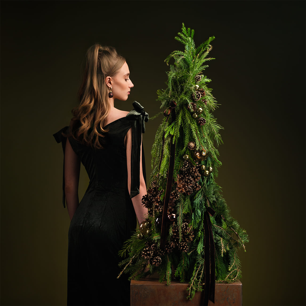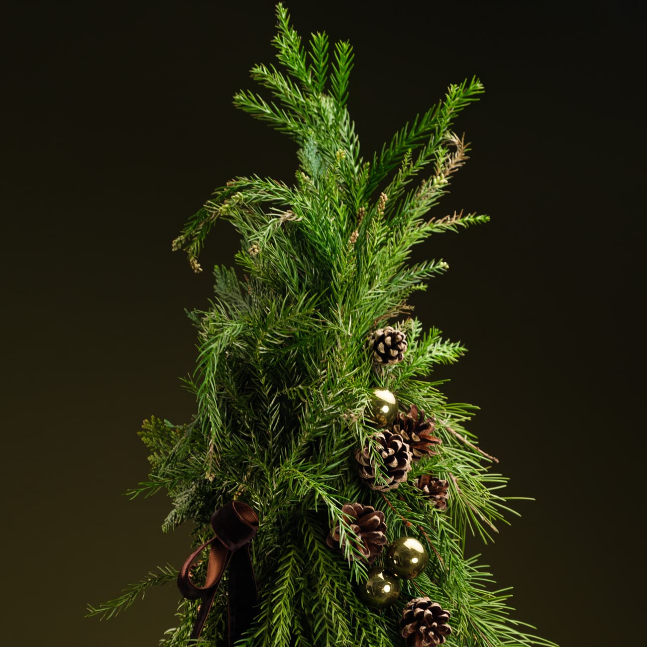 Елка создана из живой хвои разных видов, натуральных шишек. Украшена прозрачными стеклянными шарами коричневых оттенков и бархатной лентой.