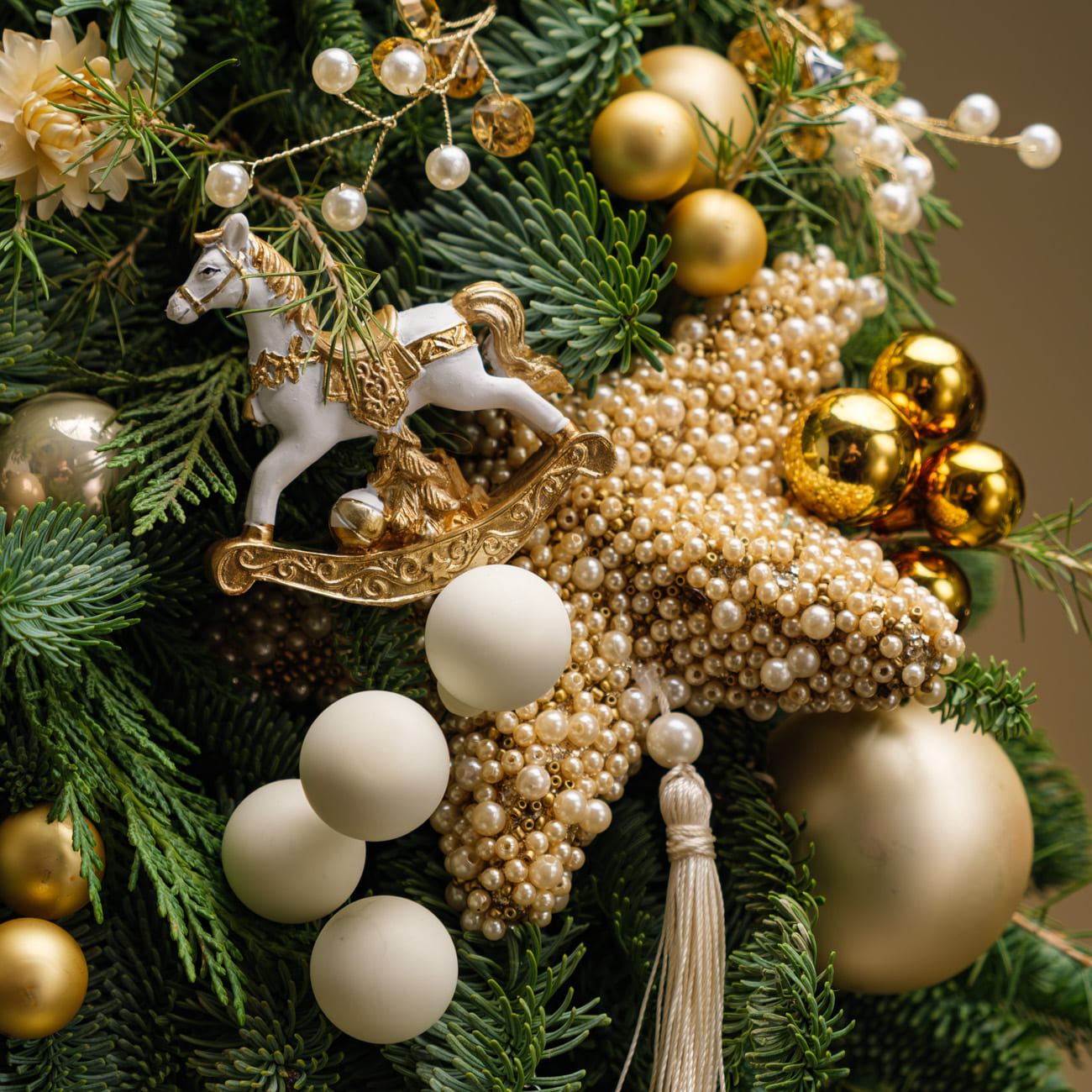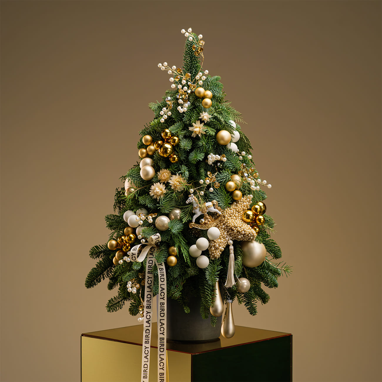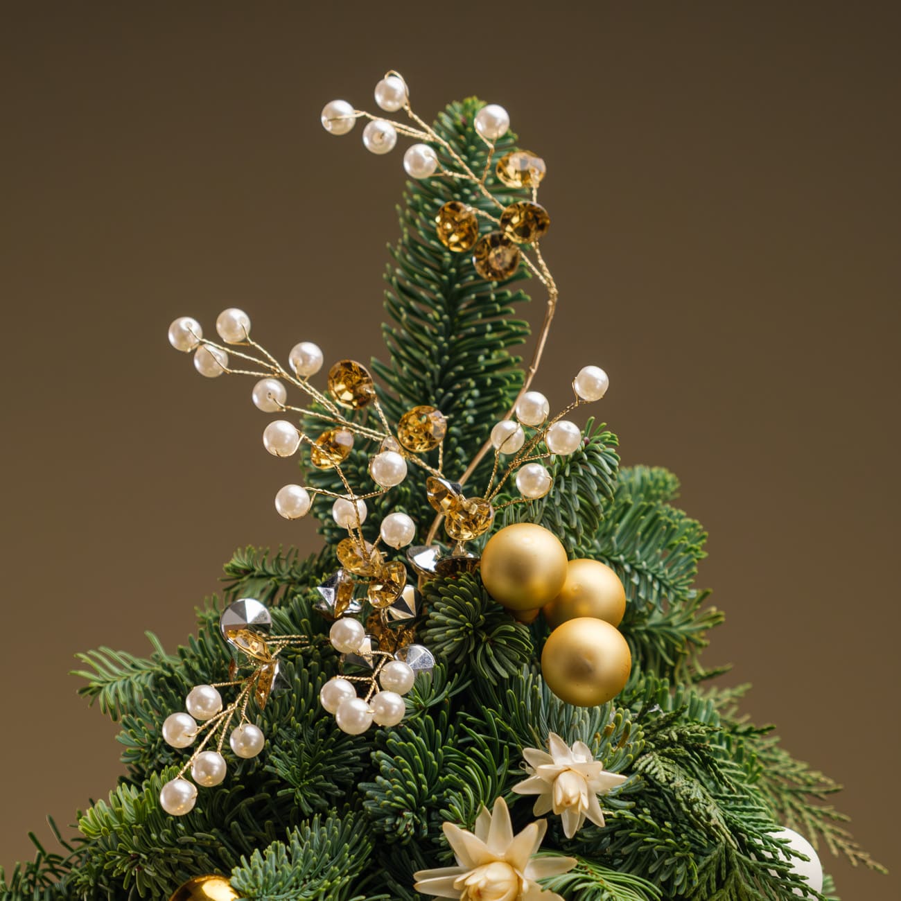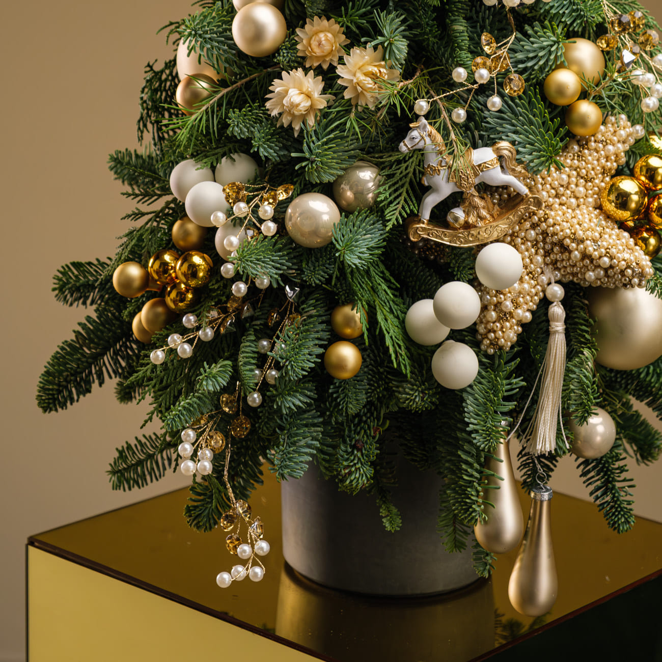 Она создана из живой хвои разных видов, украшена стеклянными шарами благородного золотого и белого цветов. Звезда, украшенная россыпью жемчужных бусин, и ветки с кристаллами добавляют композиции особое очарование. А нежные цветы гелихризума создают финальный штрих, превращая елку в настоящее произведение искусства.