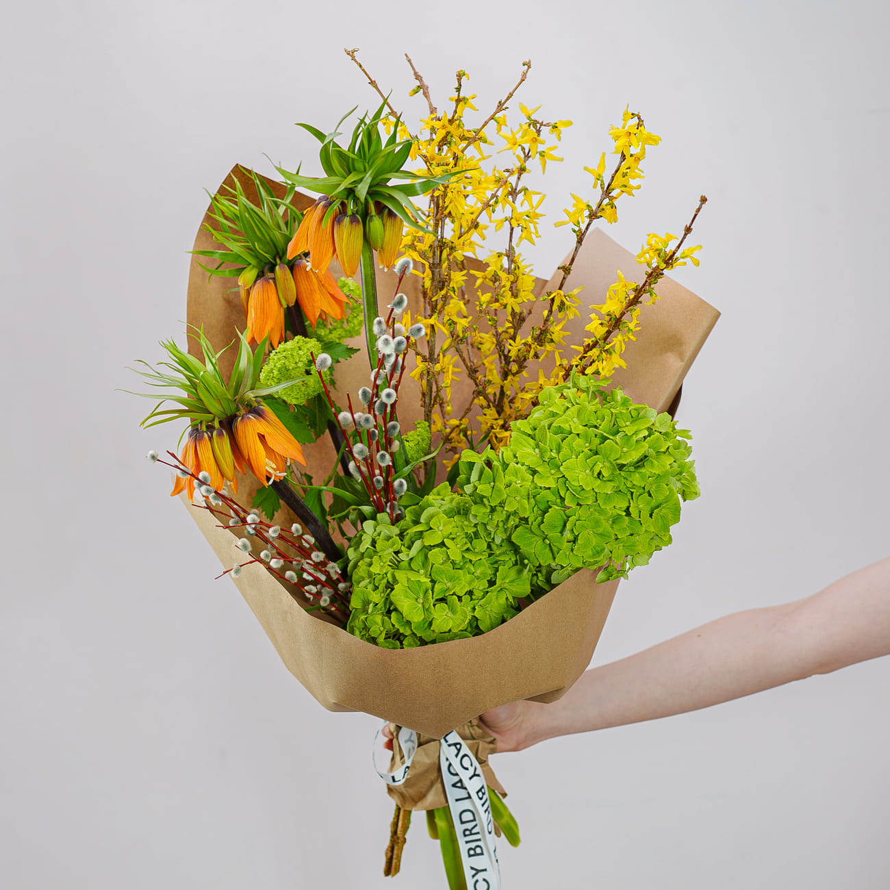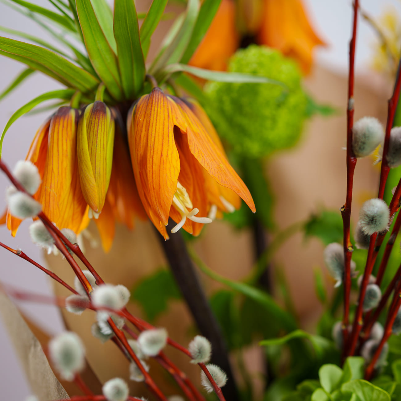 Композиция из свежих сезонных цветов: благородные фритиллярии, пышные гортензии, ветви цветущей форзиции и пушистые побеги вербы, дополненные вибурнумом.