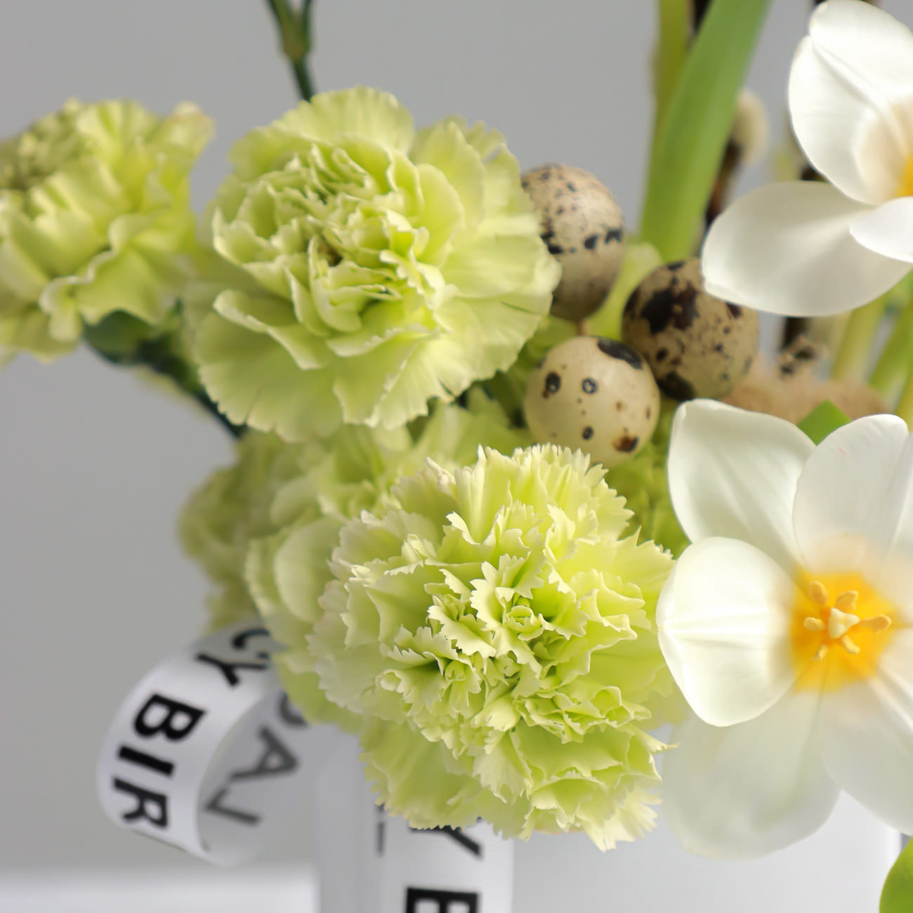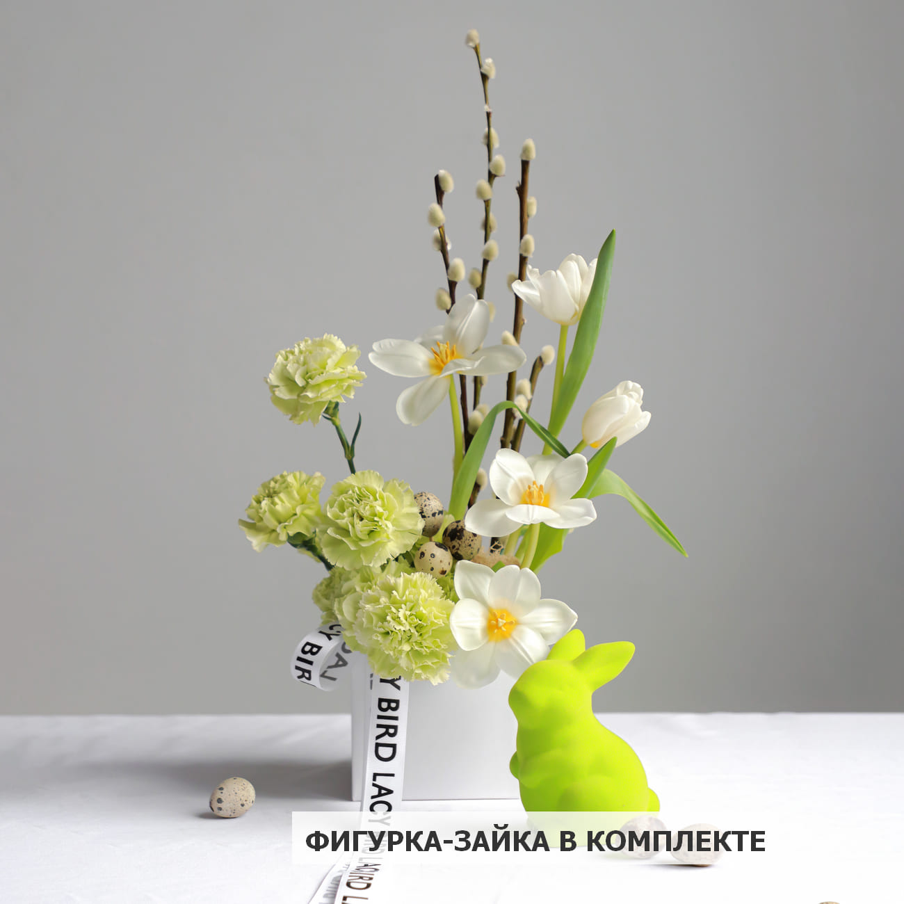 Изюминкой является ярко-зеленый зайка, который добавляет веселую и праздничную атмосферу. Композиция украшена декоративными яйцами, что усиливает пасхальное настроение.