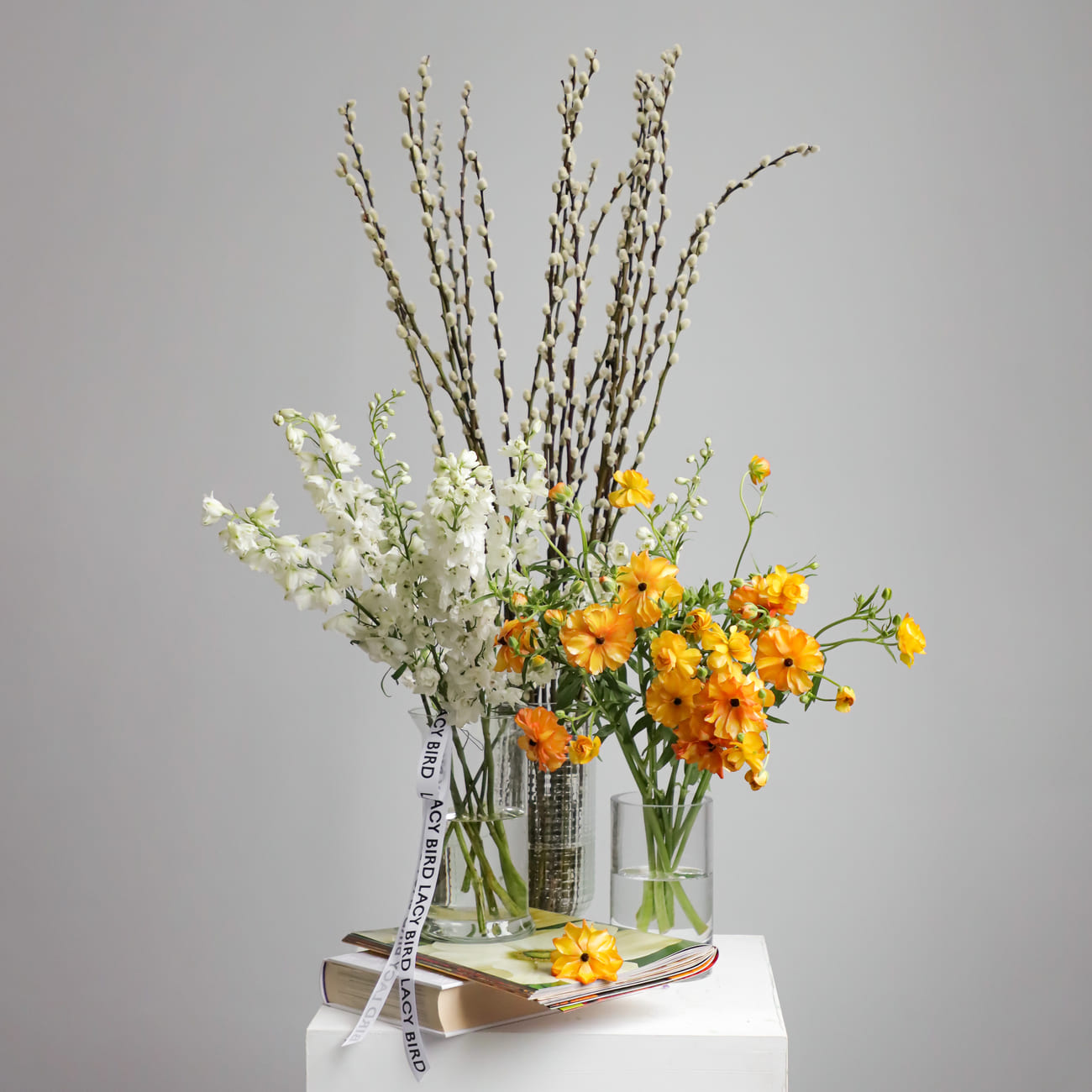 Сет представляет собой гармоничное сочетание ярких и мягких оттенков, в основе которого оранжевые ранункулюсы, создающие теплую и радостную атмосферу. Белые цветы добавляют свежести и контраста, делая композицию более изящной. Включение веток вербы придаёт букету весеннее настроение, подчёркивая природную красоту и лёгкость.