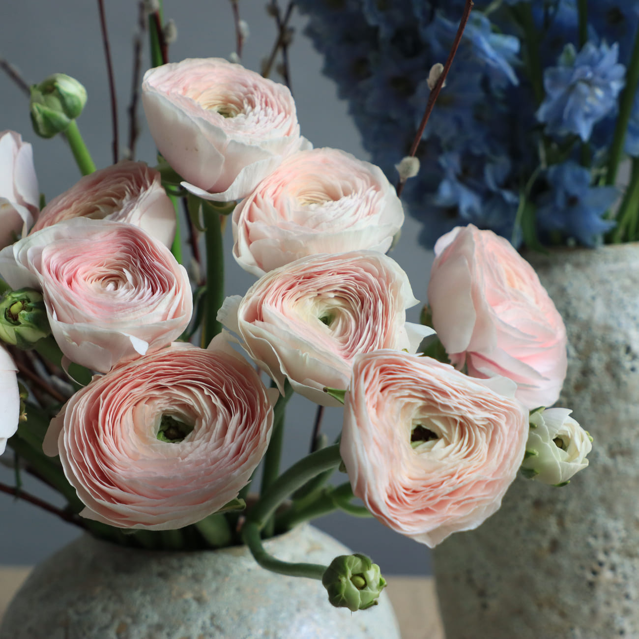 Этот цветочный сет, в который входят ранункулюсы, дельфиниум, нерине и веточки вербы, излучает свежесть и элегантность, создавая атмосферу весенней радости и оживления. Розовые ранункулюсы становятся акцентом композиции, добавляя ей нежности и воздушности.