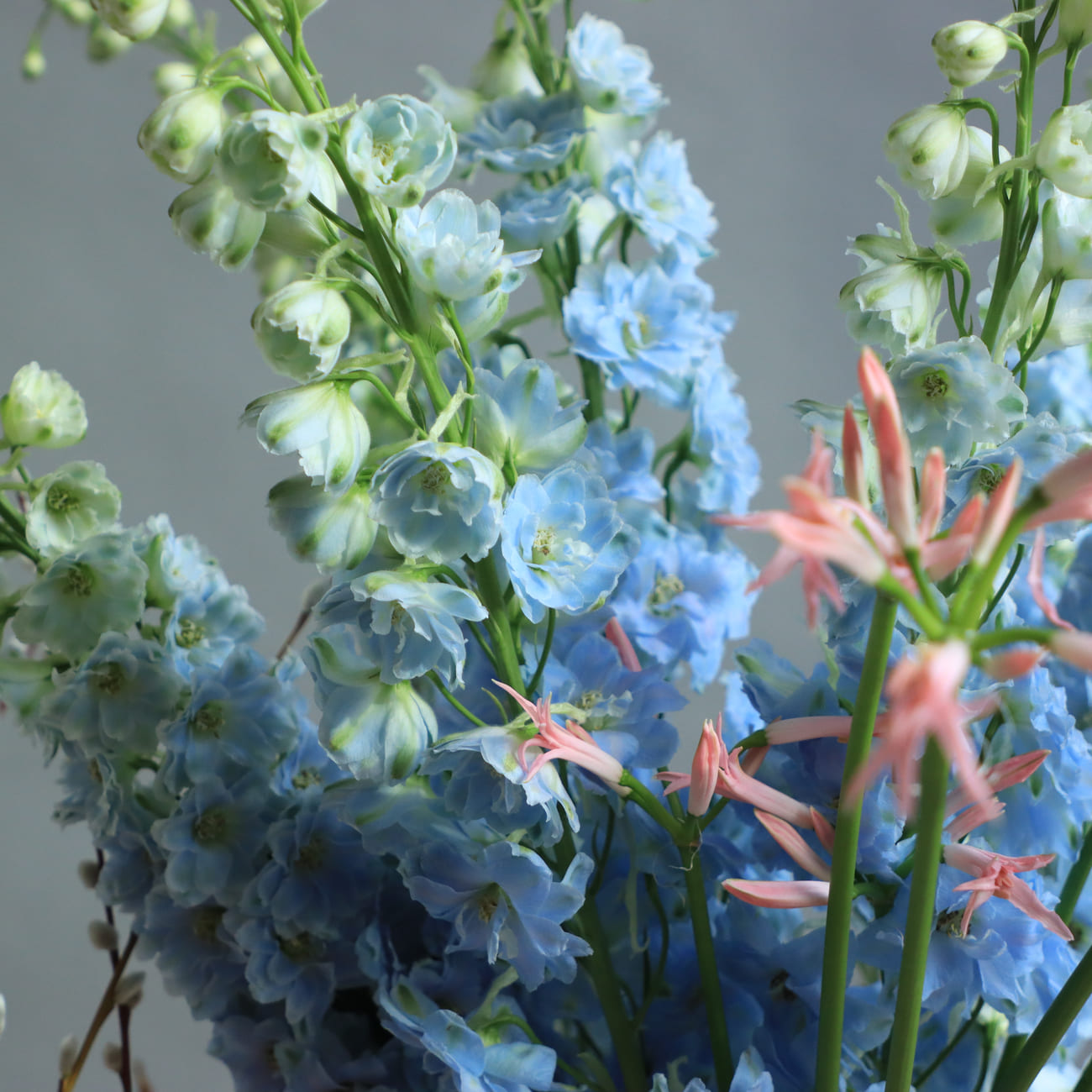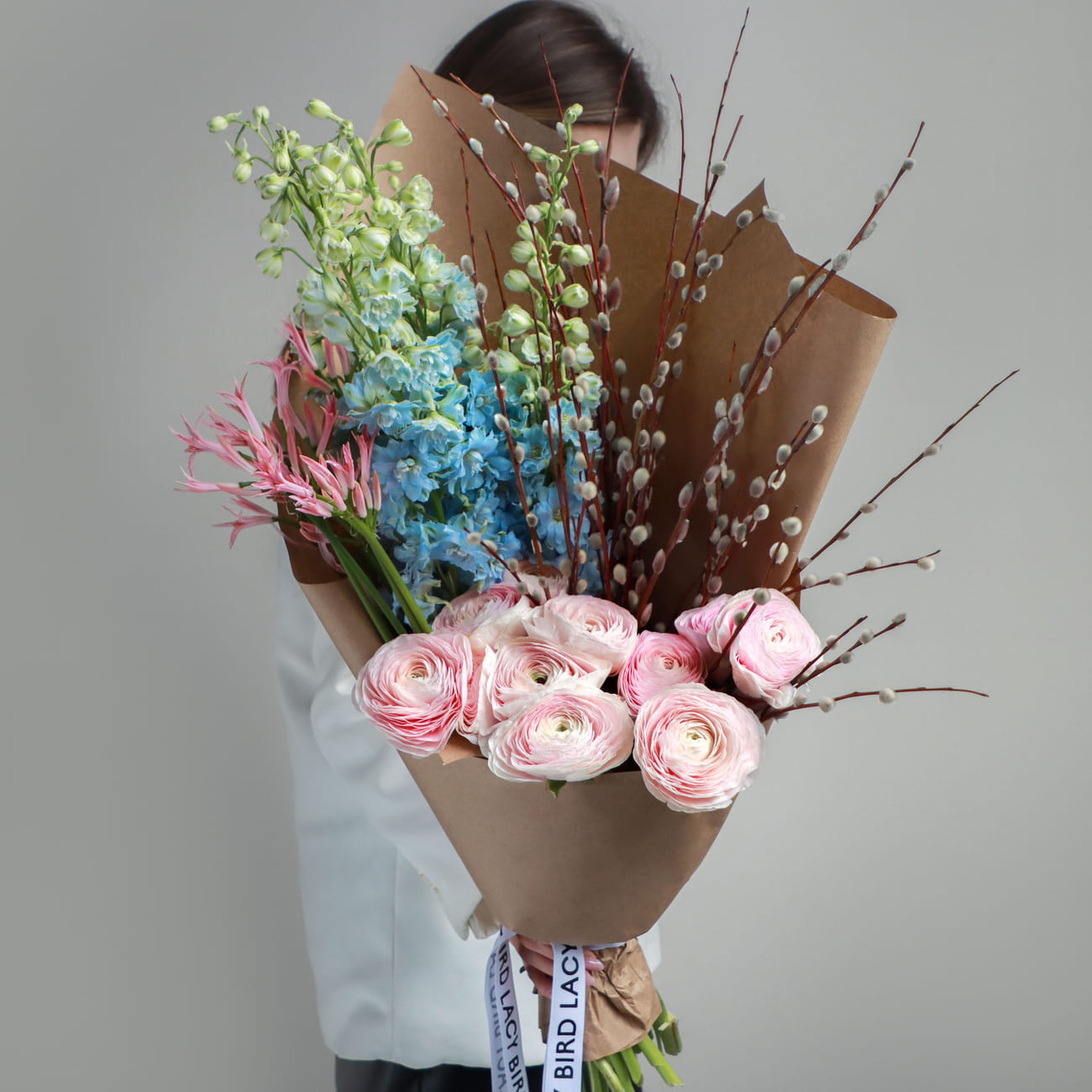 Голубые дельфиниумы приносят в букет глубину и яркость, гармонично сочетаясь с зелёными элементами, которые вносят природный акцент. Ветки вербы с пушистыми почками добавляют текстурный элемент и легкость.