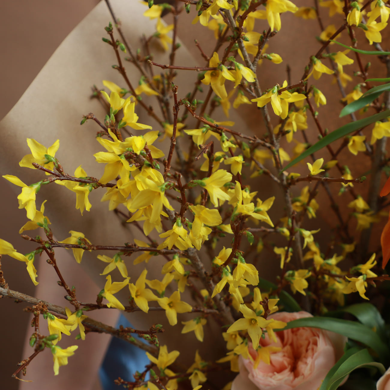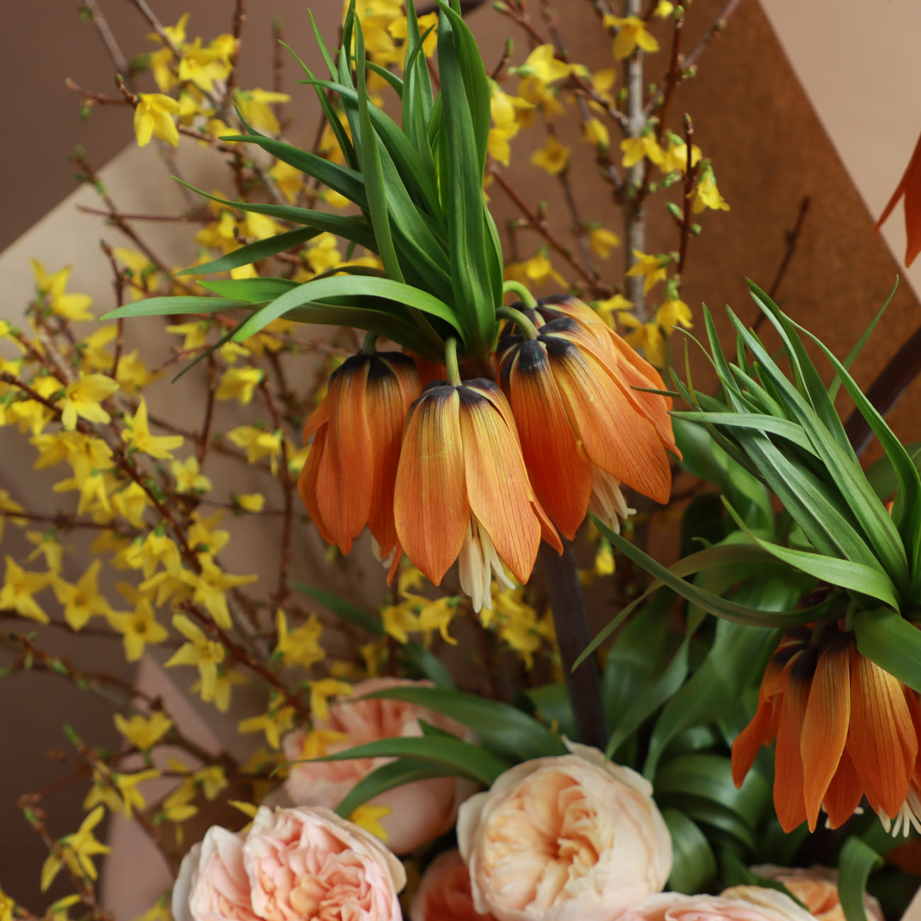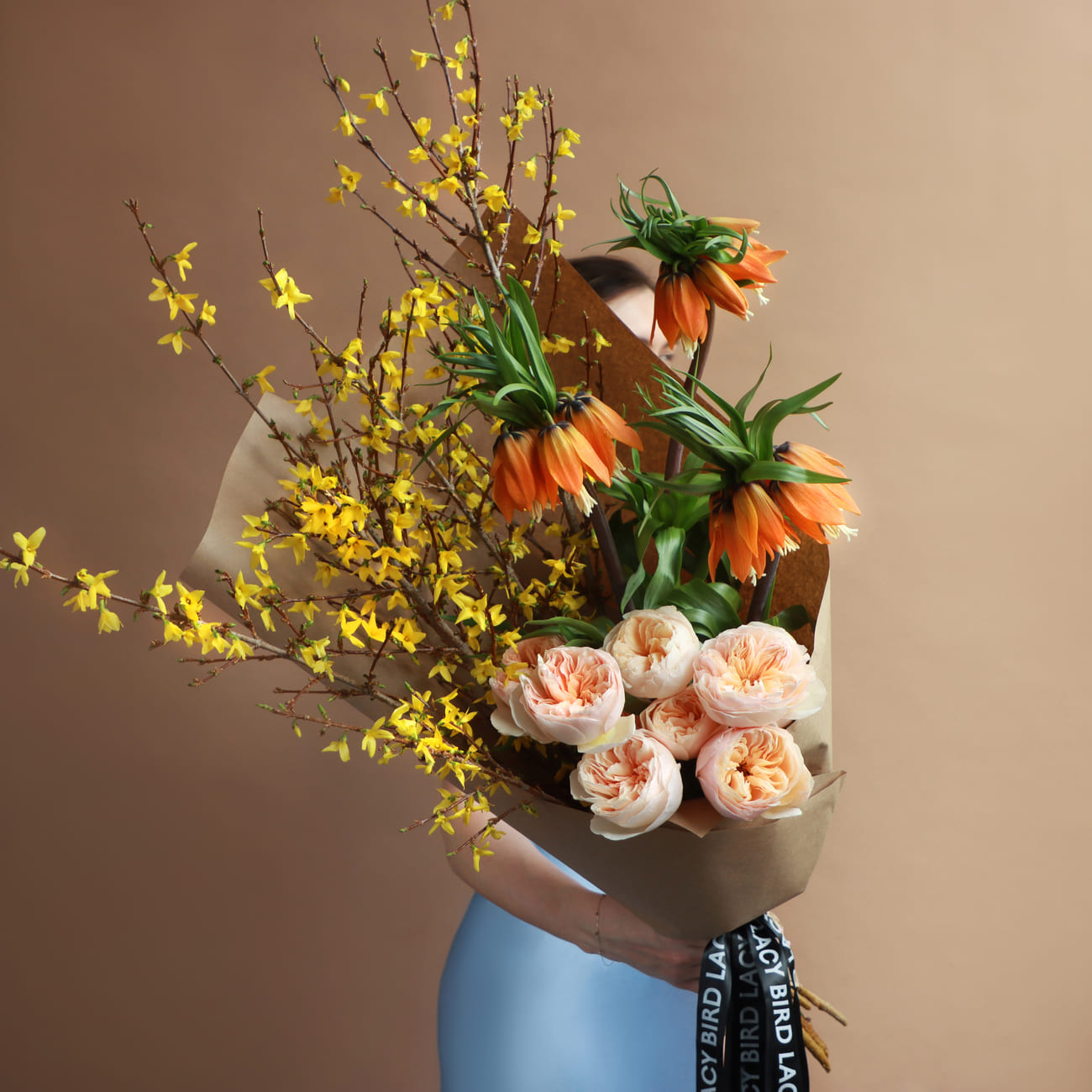 Яркая оранжевая фритиллярия добавляет энергию композиции. Жёлтые веточки форзиции вносят солнечное настроение, делая букет по-настоящему весенним.