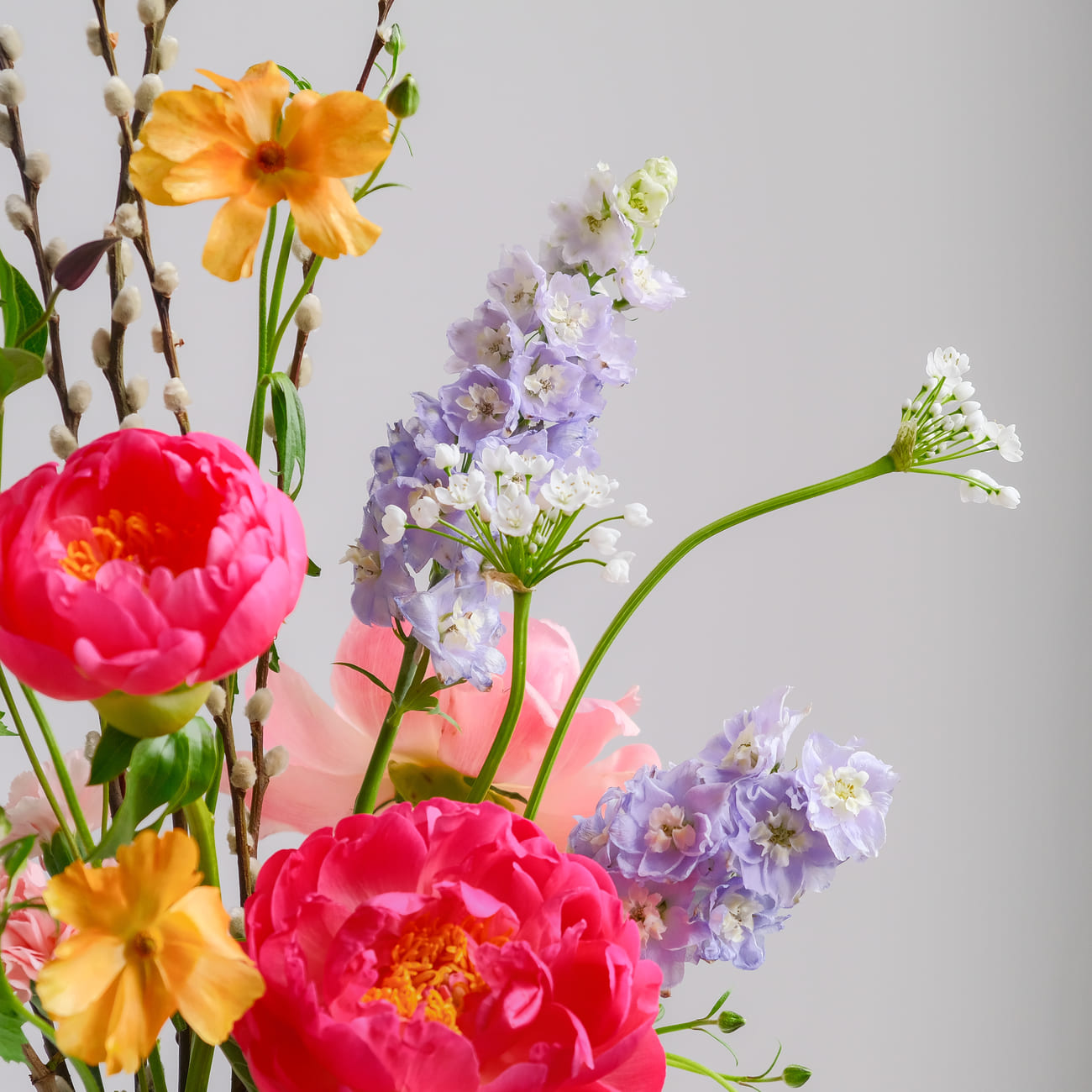 Дельфиниум добавляет композиции глубину и изысканность. Верба подчеркивает природность.