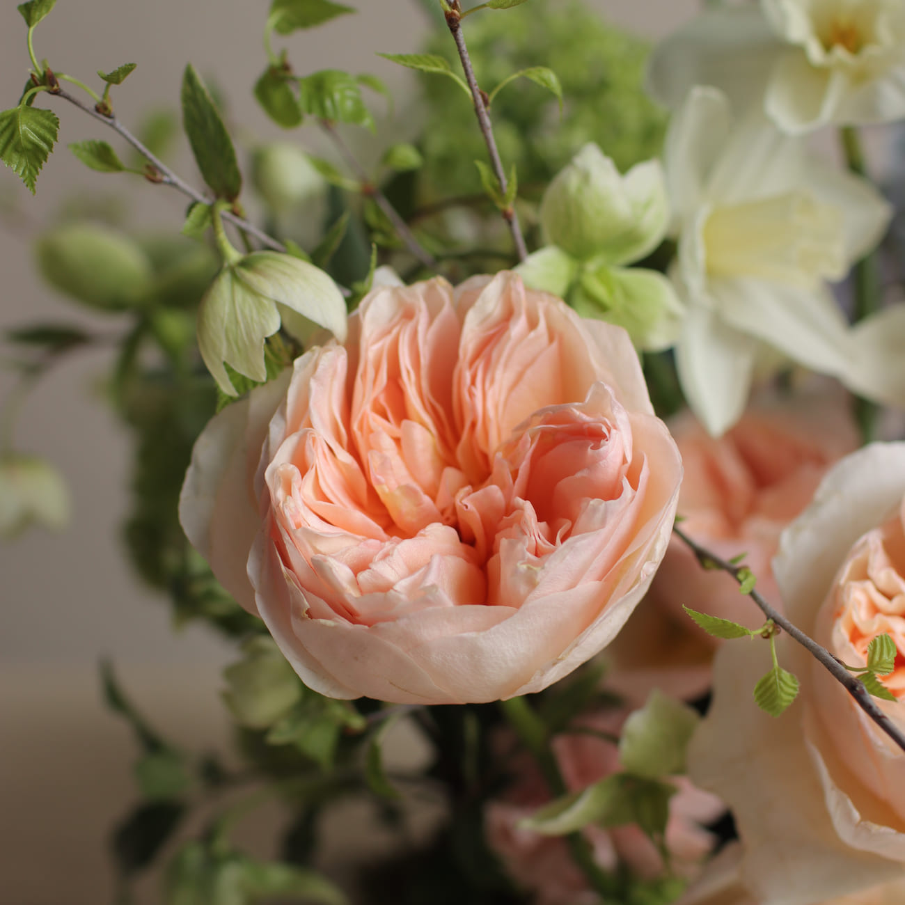 Пасхальная композиция "Доброе утро" излучает весеннюю свежесть и изящество, представляя собой красочную гамму цветов, собранных в нежную плетеную корзину. Розы и ранункулюсы в нежных оттенках придают композиции романтичность и утонченность. Голубые дельфиниумы и белые нарциссы добавляют легкости и элегантности, а зелёные акценты приносят естественную свежесть. Хелеборус и маттиола вносят текстурное разнообразие, подчёркивая природную красоту букета. Веточки диантуса гармонично завершают ансамбль, добавляя изящества.