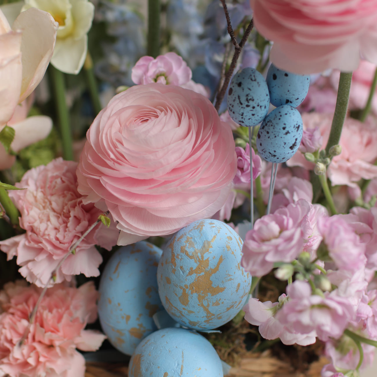 Композиция украшена декоративными яйцами, создавая весеннее настроение и пасхальную атмосферу.