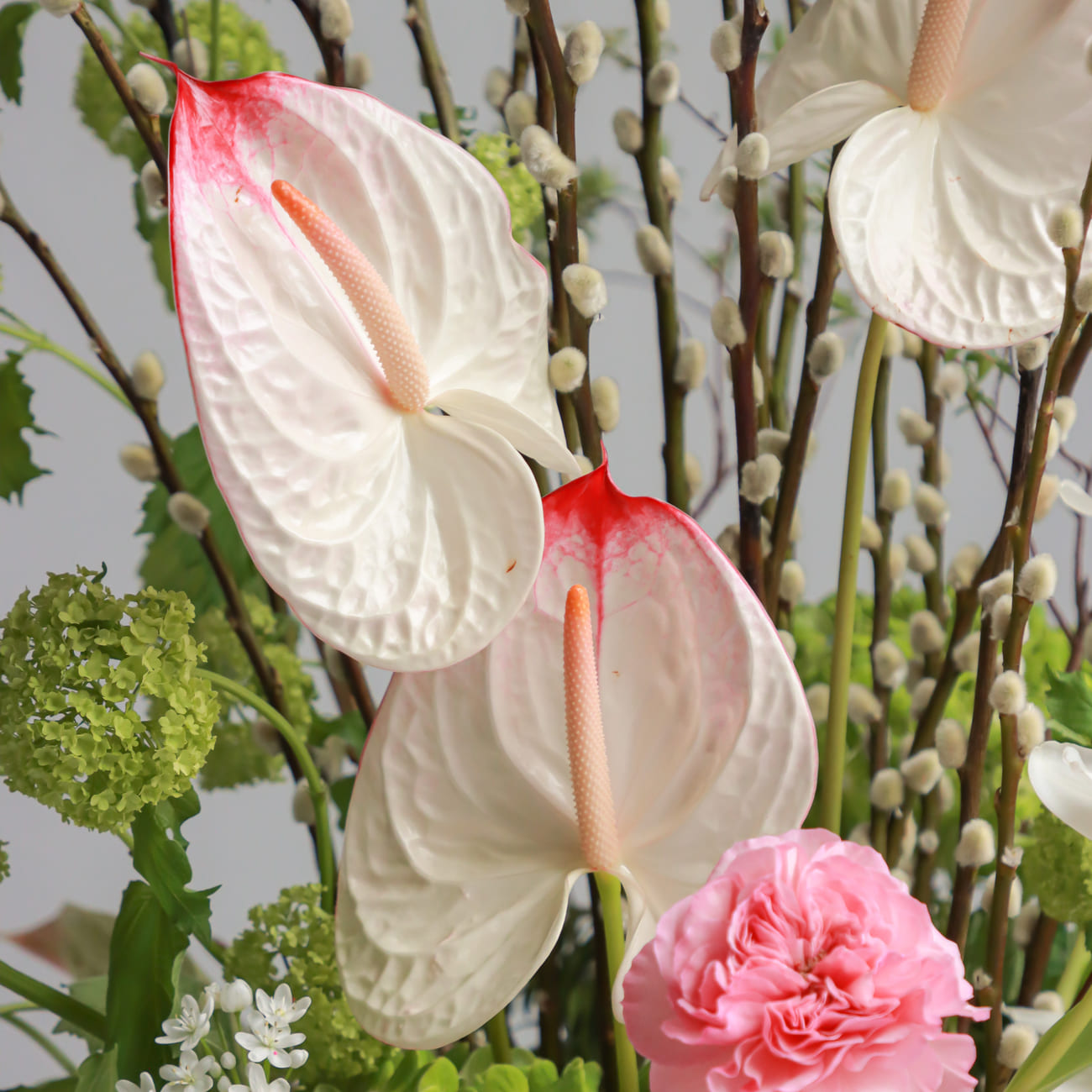 Эта пасхальная композиция в вазе излучает утонченное сочетание яркости и нежности. Розовые розы и белые антуриумы привносят в букет изящество и мягкость, тогда как зелёные шары гортензий добавляют свежести и объёма. Ветки вербы с почками и спускающиеся вниз ярко-зелёный амарант создают эффект динамики, похожий на грациозный водопад.