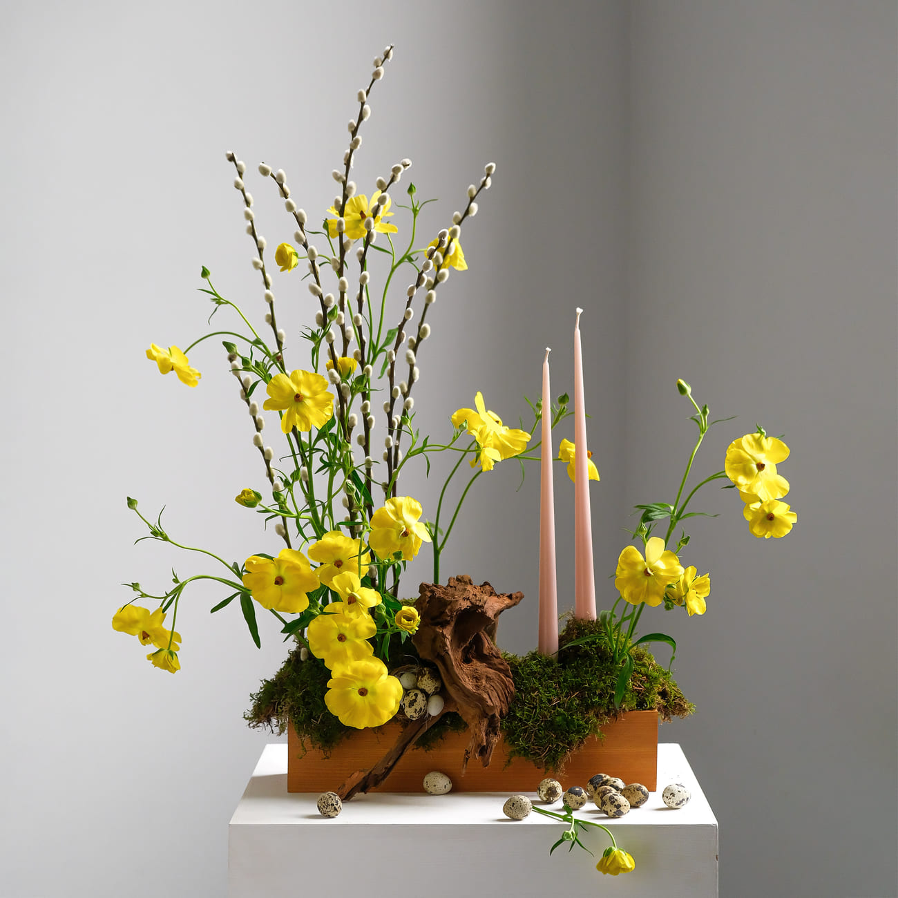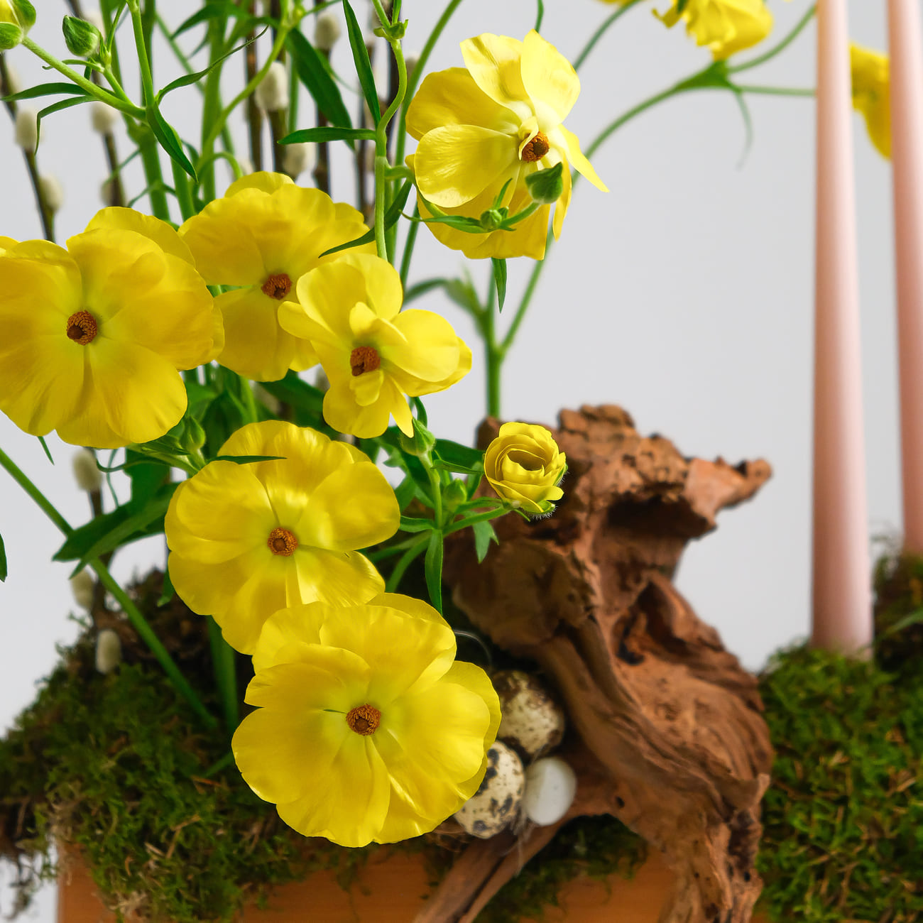 Пасхальная композиция «На лужайке» собрана в стильном ящике. Яркие ранулюксы служат центральным декоративным элементом, их нежные лепестки раскрываются в изящном танце весенних красок. Верба добавляет текстуру и символизирует пробуждение природы к новому началу, создавая ощущение умиротворения и связи с традициями.