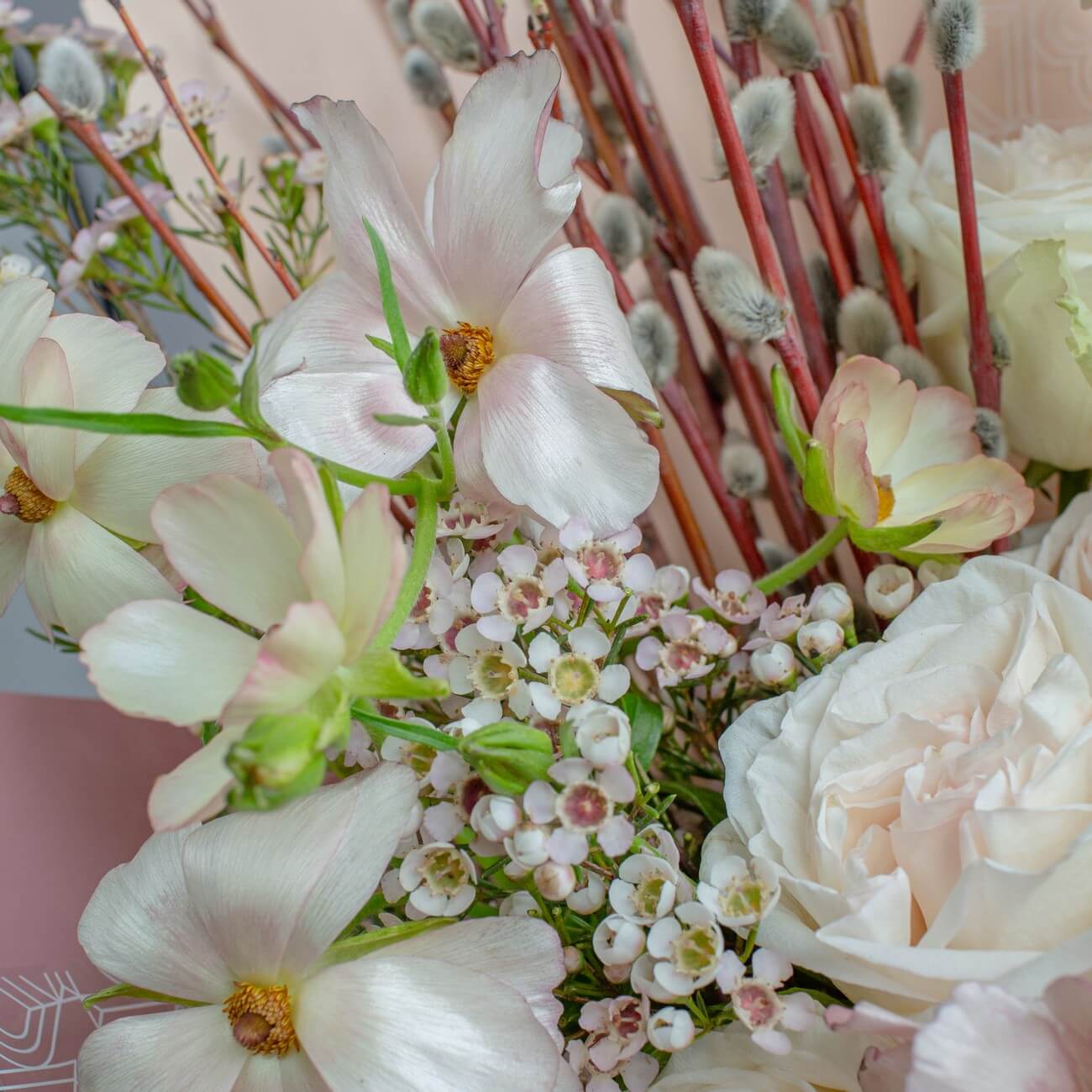 Пасхальный букет из пионовидных роз, ранункулюсов, хамелациума и вербы — это благородное воплощение весеннего обновления и праздничного настроения.