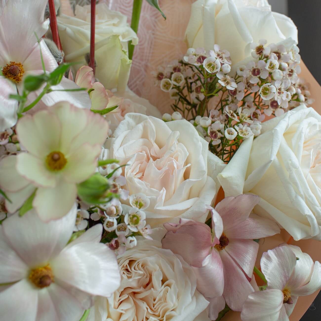 Свежие цветы от Lacy Bird доставляются в фирменной упаковке, которую необходимо снять при установке в вазу. Не срезайте ленту, связывающую букет для сохранения формы.