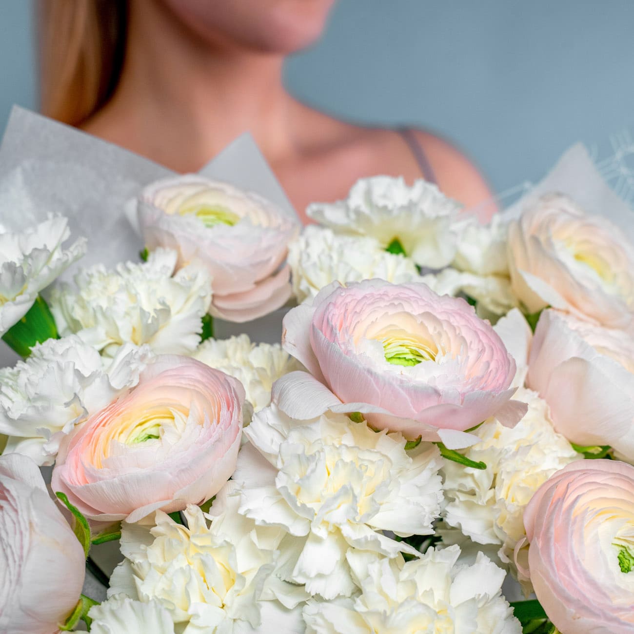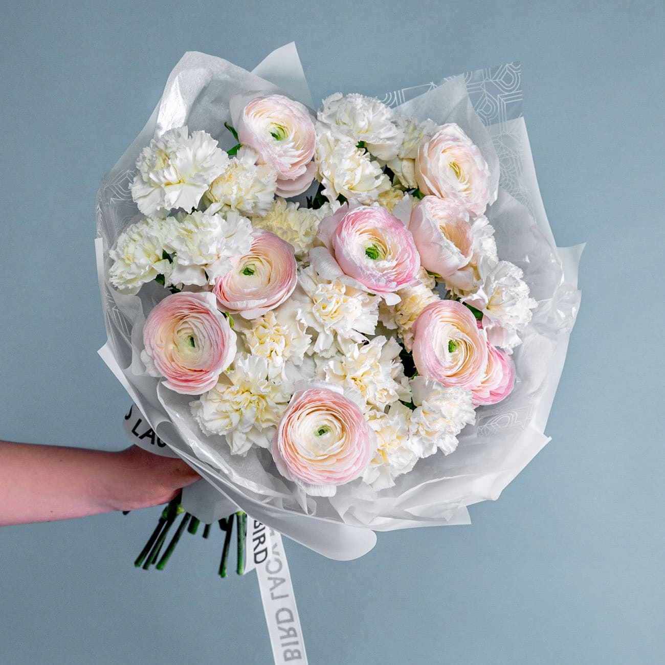 Дуобукет "Магия момента" — это изысканное сочетание свежих ранункулюсов и нежных диантусов, которое подарит вашему дню особую атмосферу. Ранункулюсы, с их мягкими розовыми оттенками, символизируют любовь и нежность, а белоснежные диантусы добавляют элегантности и утонченности.