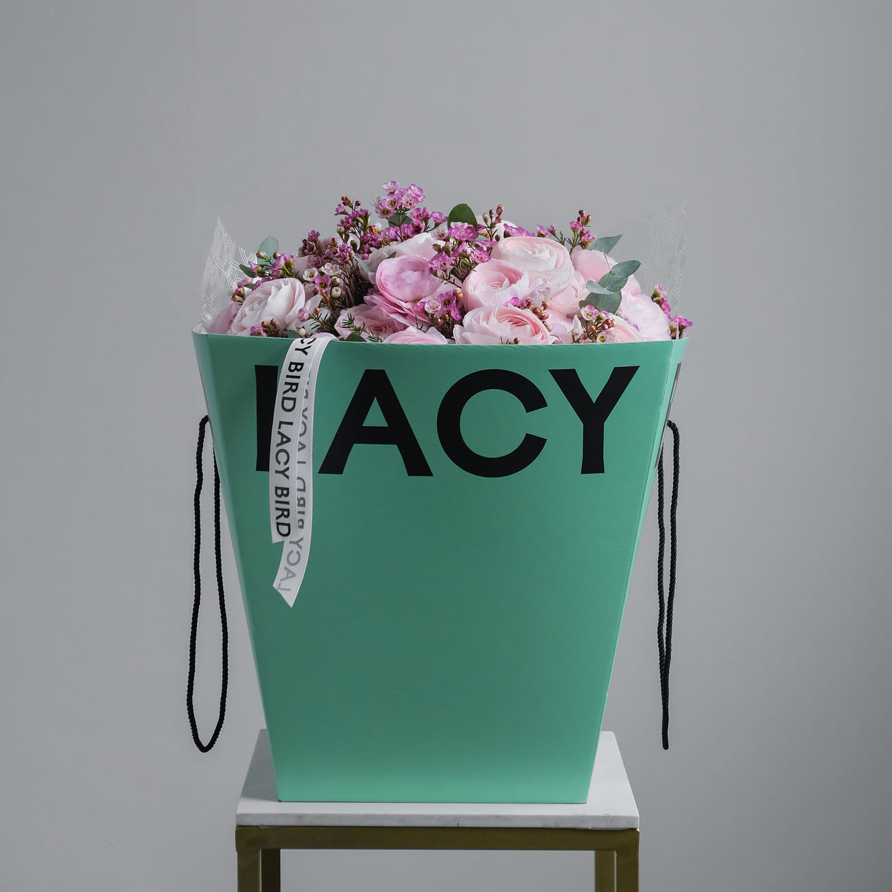 Свежие цветы от Lacy Bird доставляются в фирменной упаковке, которую необходимо снять при установке в вазу. Не срезайте ленту, связывающую букет для сохранения формы.