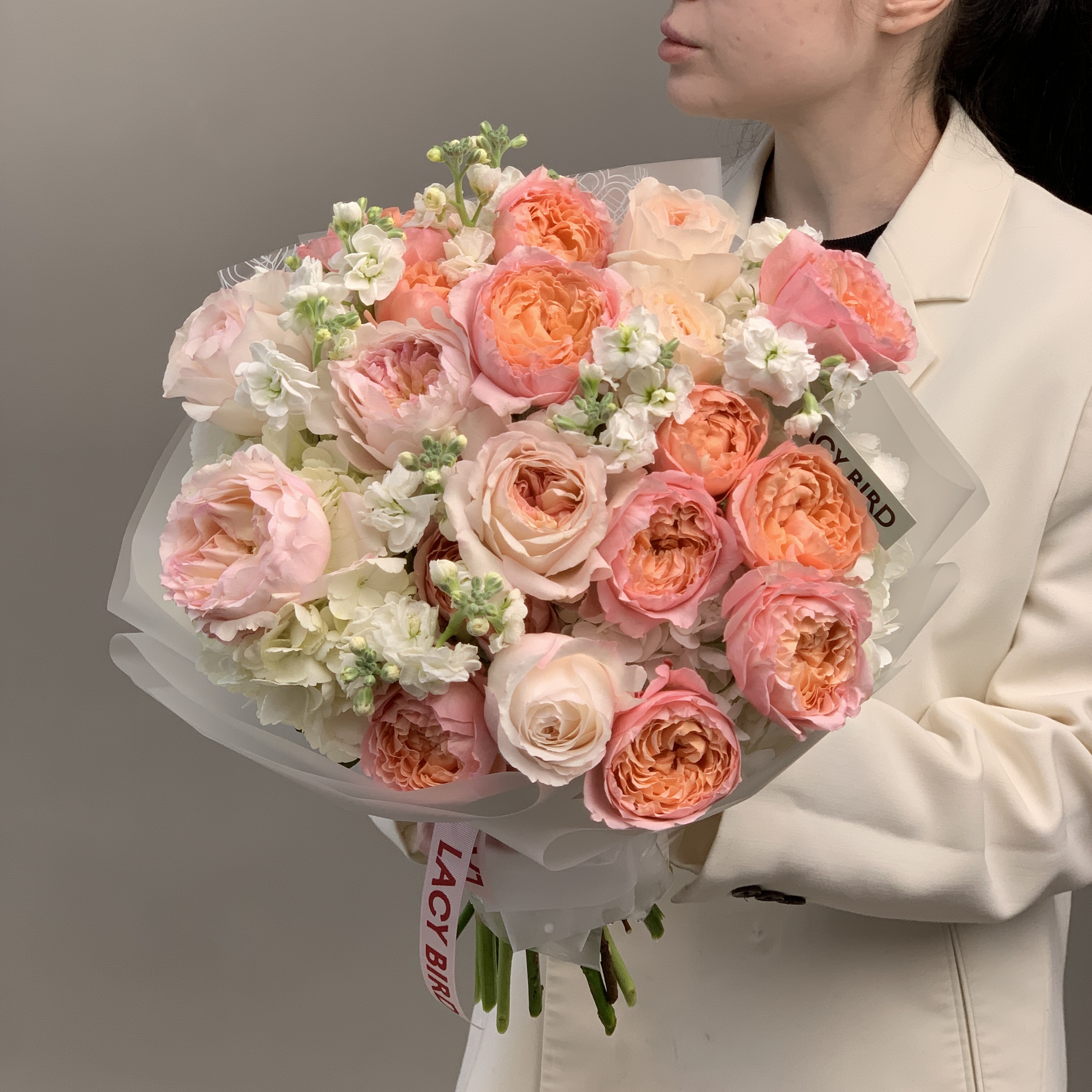 Свежие цветы от Lacy Bird доставляются в фирменной упаковке, которую необходимо снять при установке в вазу. Не срезайте ленту, связывающую букет для сохранения формы.