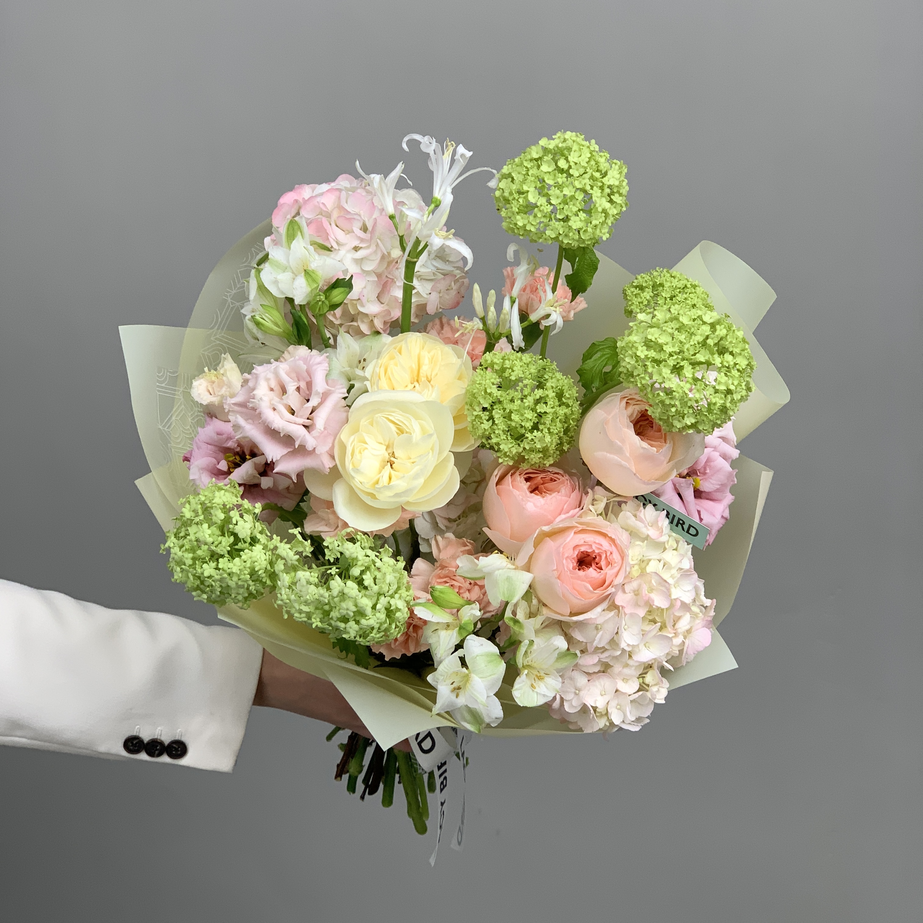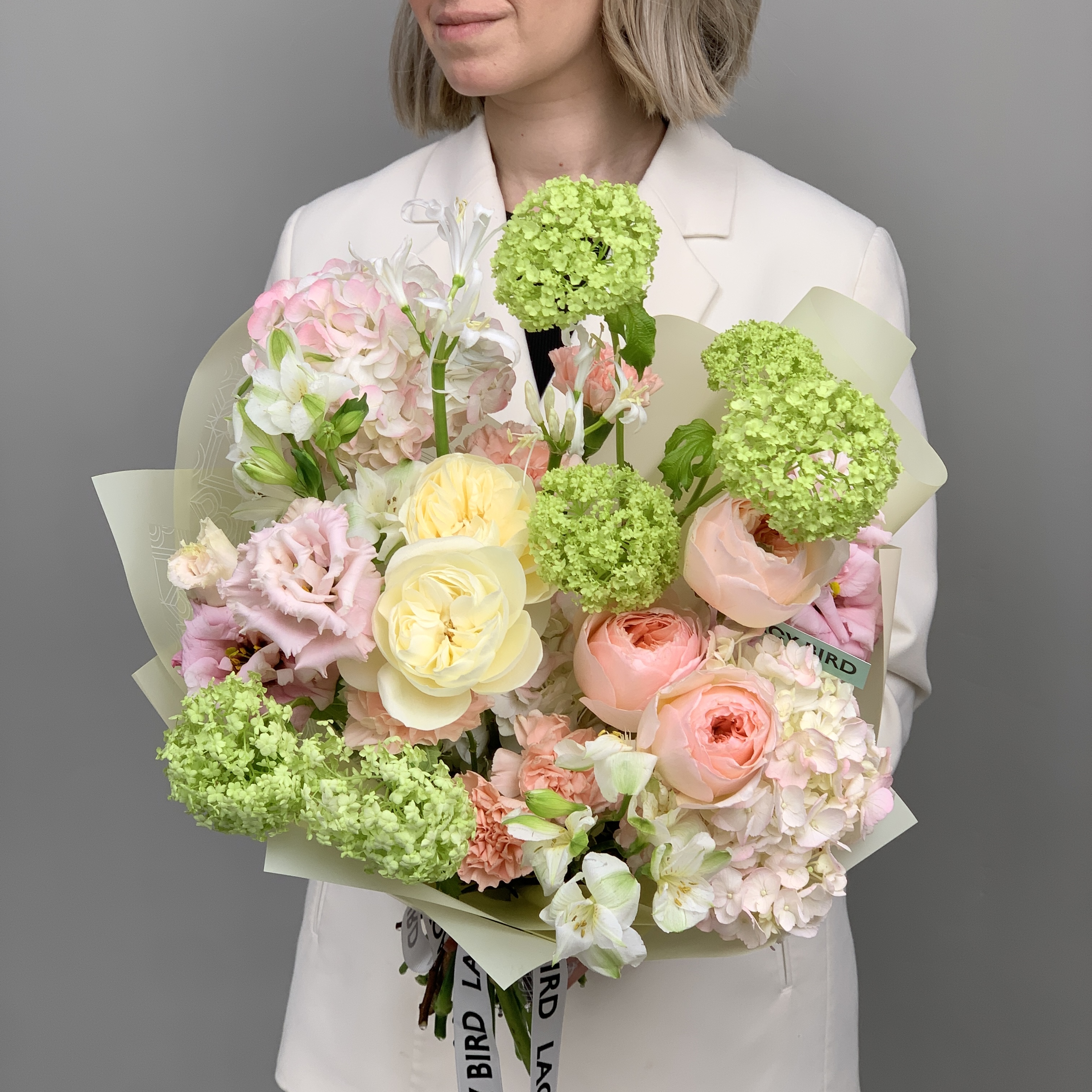 Свежие цветы от Lacy Bird доставляются в фирменной упаковке, которую необходимо снять при установке в вазу. Не срезайте ленту, связывающую букет для сохранения формы.