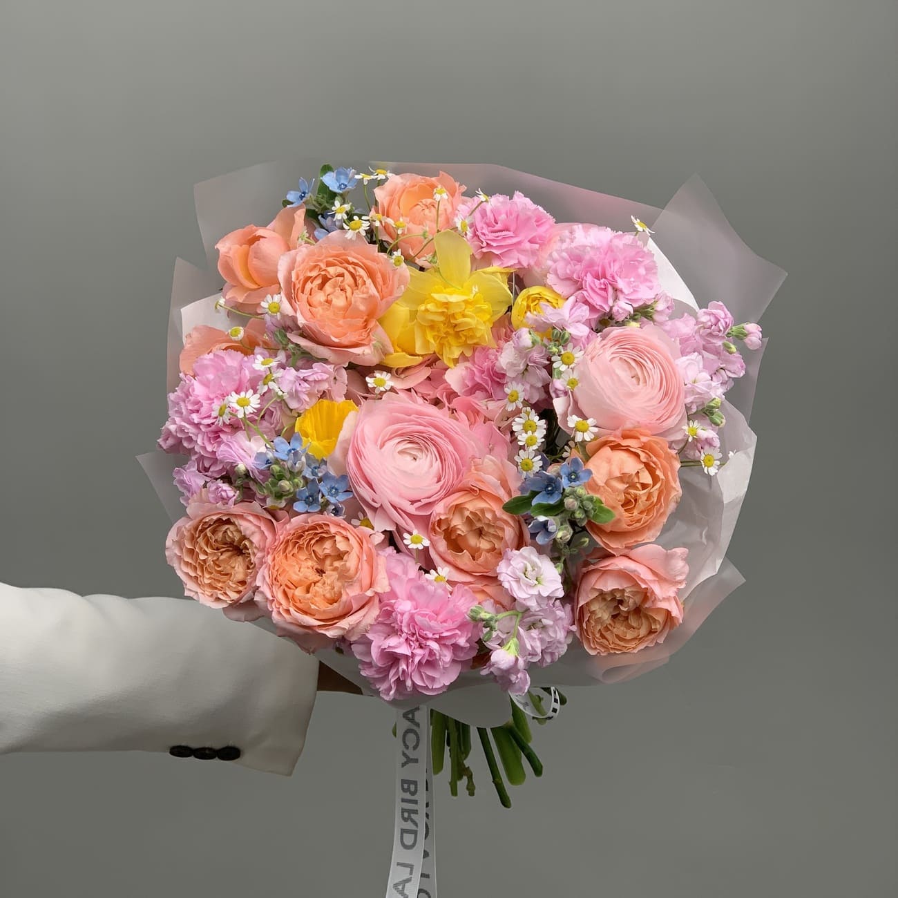 Свежие цветы от Lacy Bird доставляются в фирменной упаковке, которую необходимо снять при установке в вазу. Не срезайте ленту, связывающую букет для сохранения формы.
