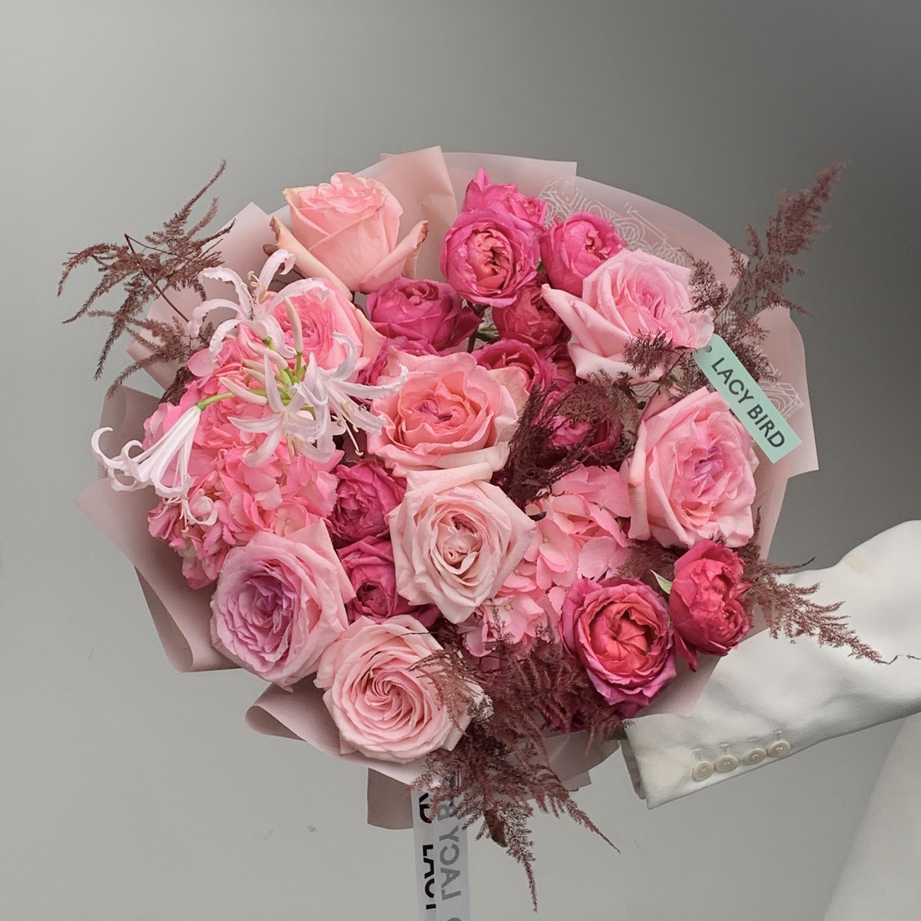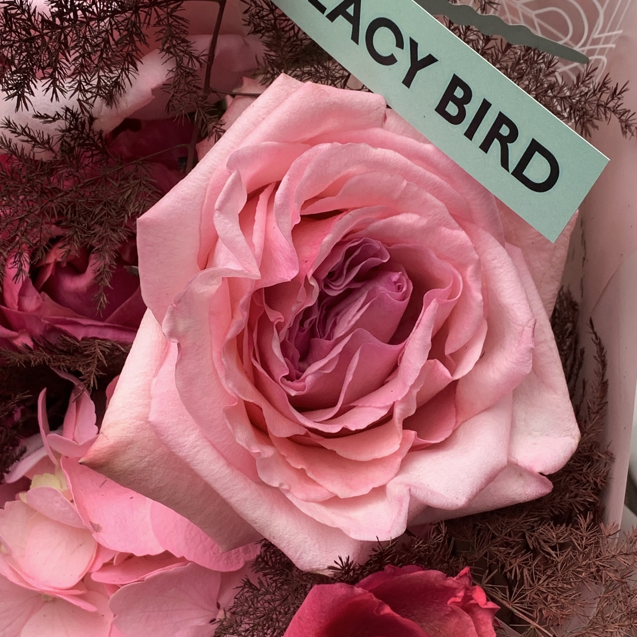 Свежие цветы от Lacy Bird доставляются в фирменной упаковке, которую необходимо снять при установке в вазу. Не срезайте ленту, связывающую букет для сохранения формы.